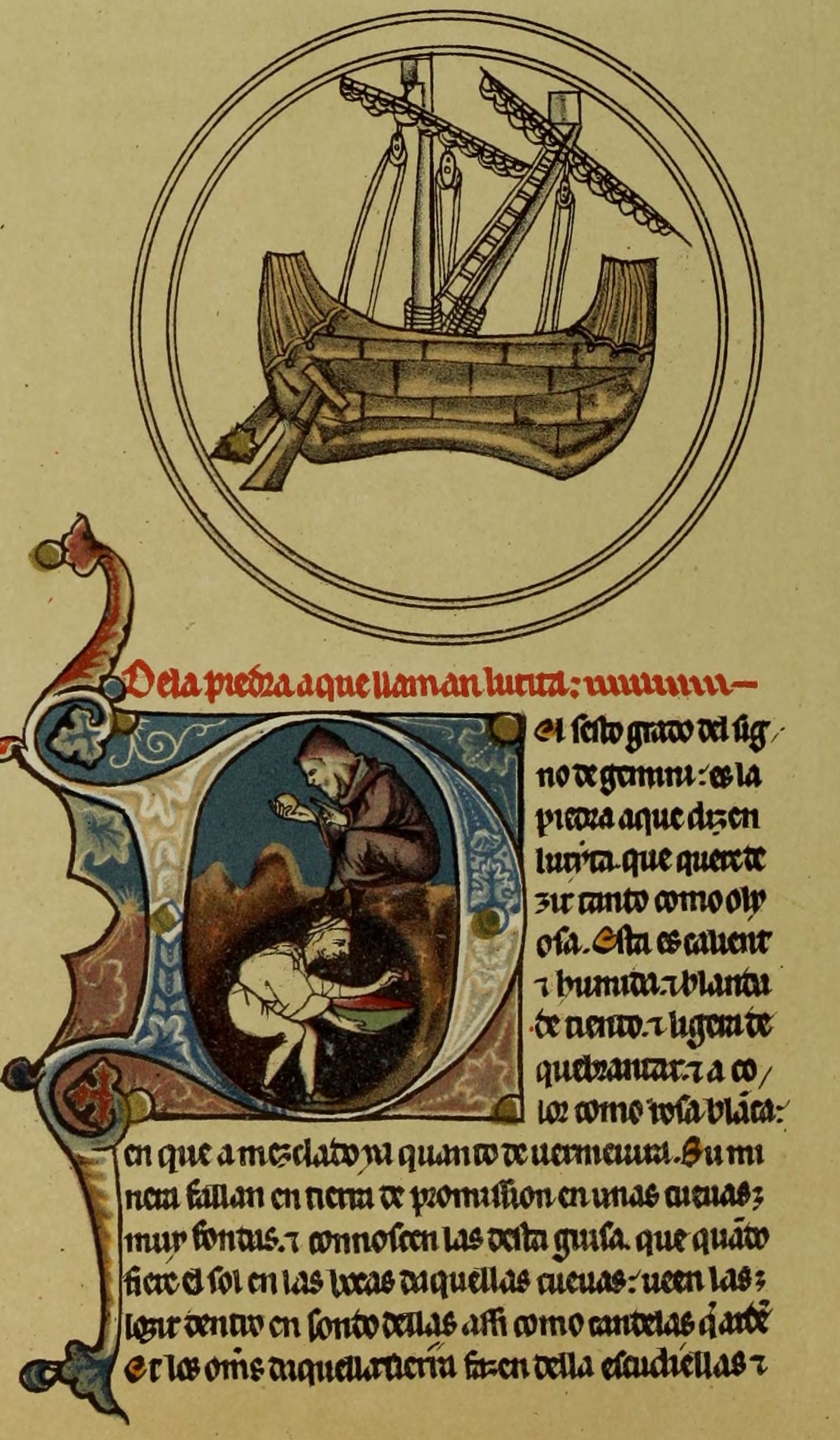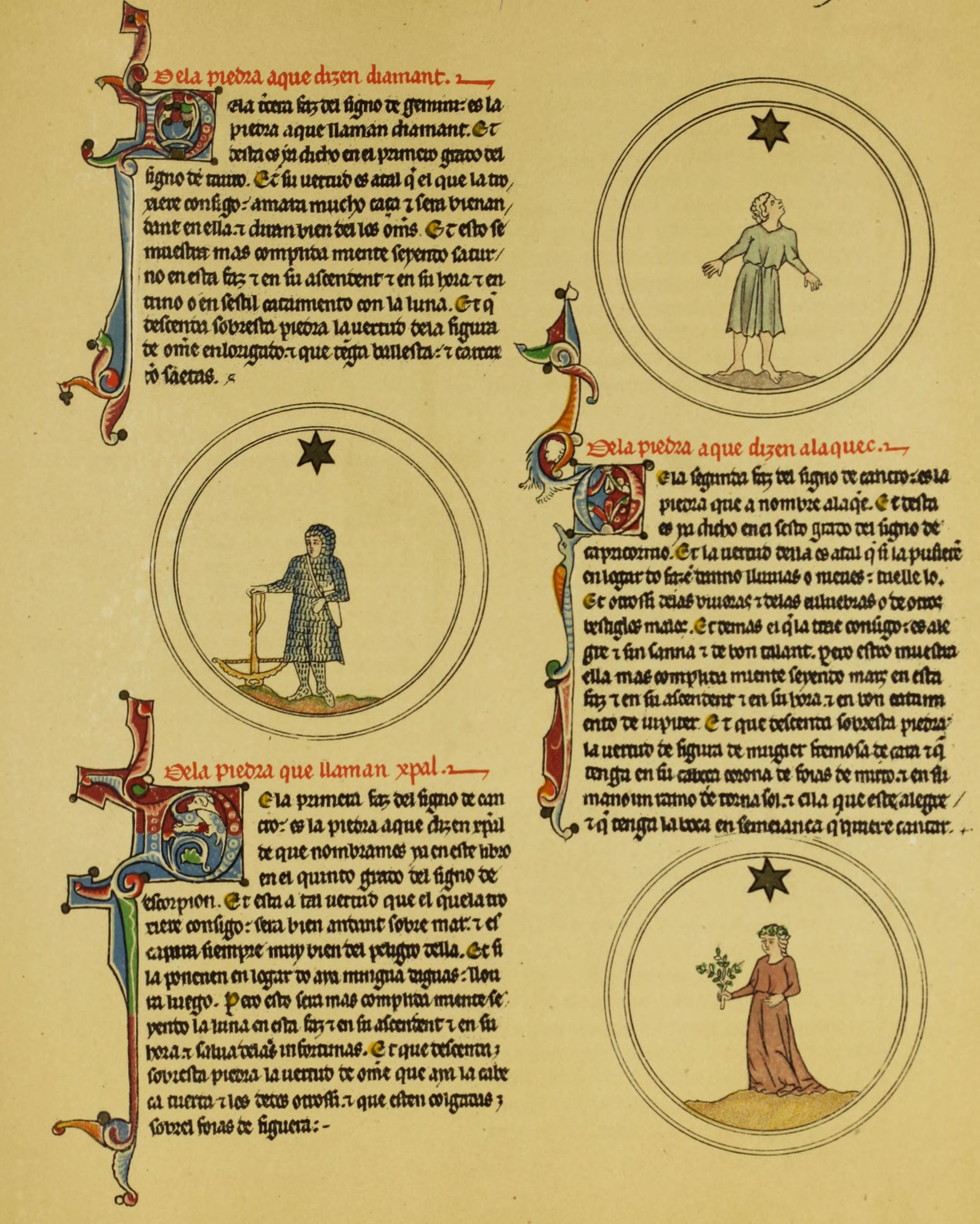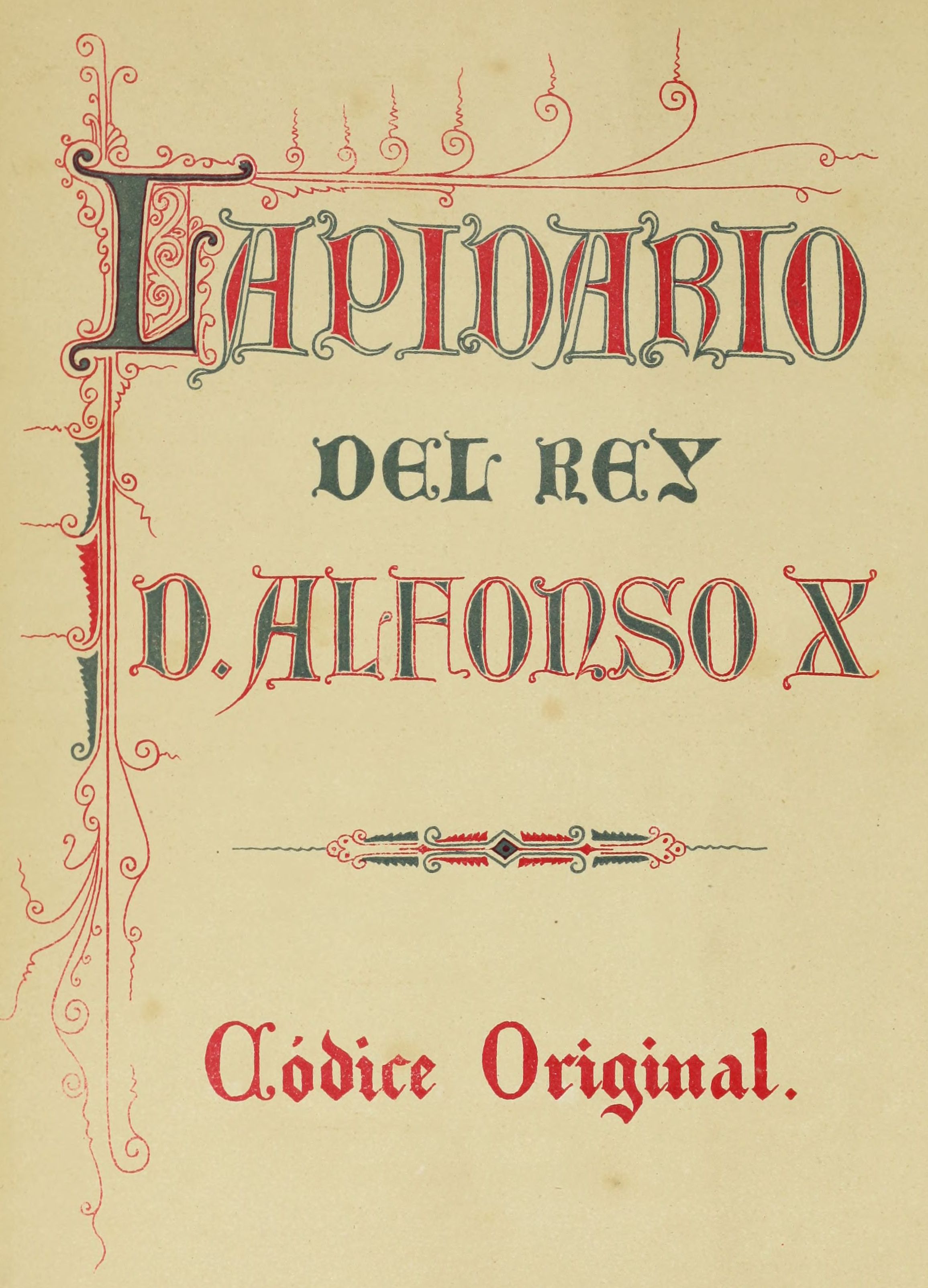 This important lapidary preserved at the Library of the royal site of Saint-Laurent-de-l'Escurial, richly illustrated and taken from Greek and Arabic sources, was translated from Arabic and perhaps augmented for Alfonso X of Castile by his medicine and astrologer Yehuda Mosca. It was originally, at least in its original form and if we are to believe the explanations in the first chapters, written in Syriac.