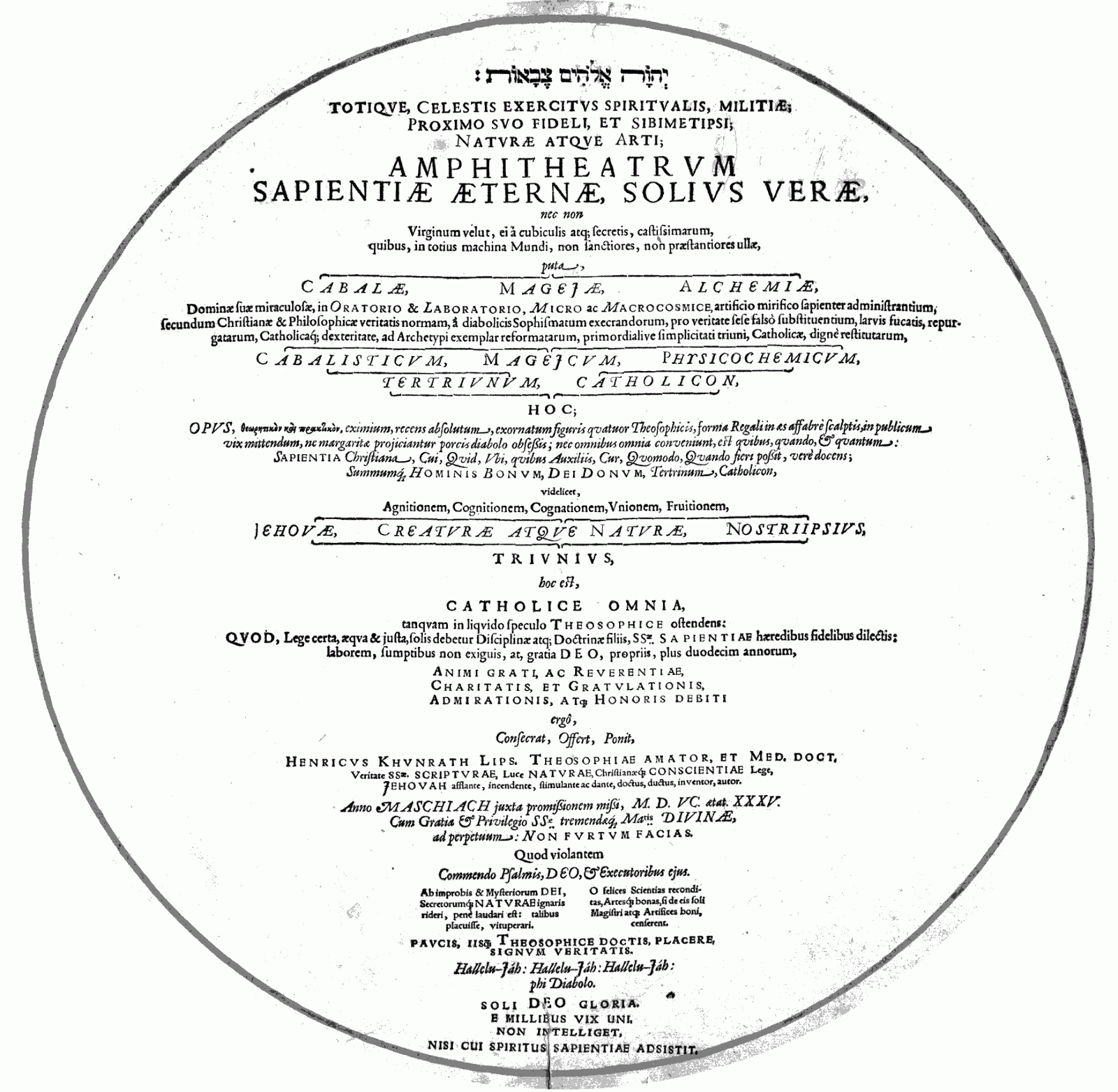 Yehovah elohim tseva'ot, totic, celestis exercitus spiritualis, militiae, proximo suo fideli, et sibimetipsi, naturae atque arti, Amphitheatrum sapientiae aeternae, solius verae: nec non virginum velut, ei a cubiculis atq[ue] secretis, castissimarum, quibus, in totius machina mundi, non sanctior es, non praestantiores ullae, puta, cabalae, magejae, alchemiae, dominae suae miraculosae, in oratorio & laboratorio, micro ac macrocosmice, artificio mirifico sapienter administrantium, secundum Christianae & philosophicae veritatis normam, a diabolicis sophismatum execrandorum, pro veritate sese falso substituentium, larvis fucatis, repurgatarum, Catholicaq[ue] dexteritate, ad archetypi exemplar reformatarum, primordiale simplicitati triuni, Catholicae, worthy restitutarum, cabalisticum, magejcum, physicochemicum, tertriunum, Catholicon.
