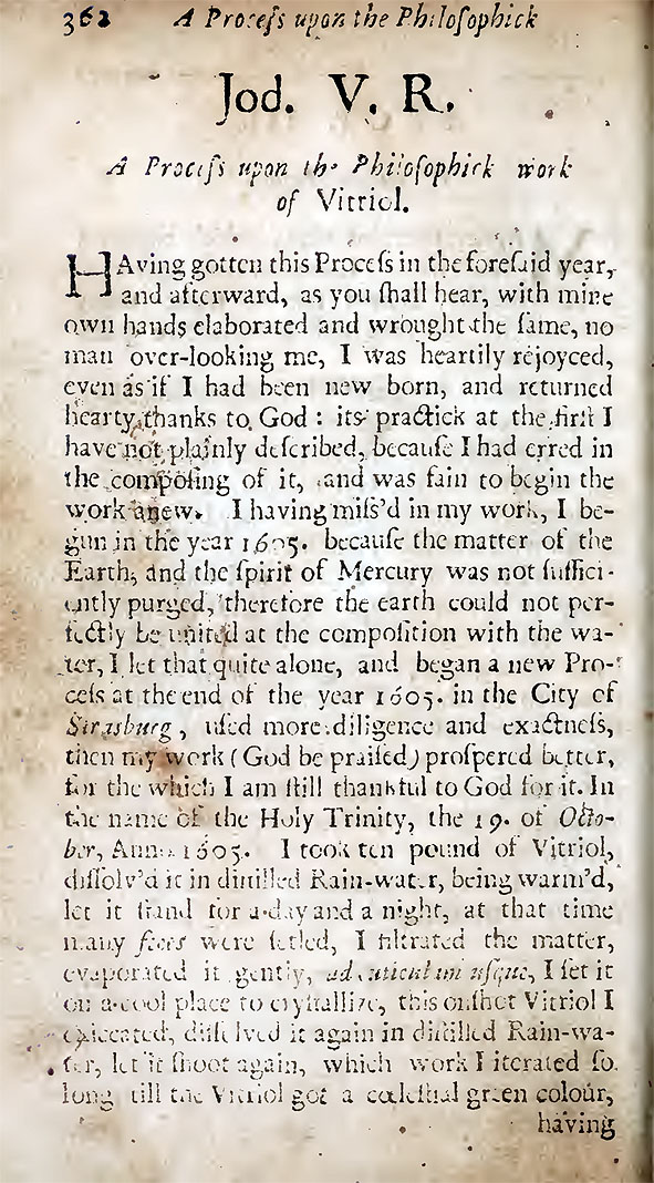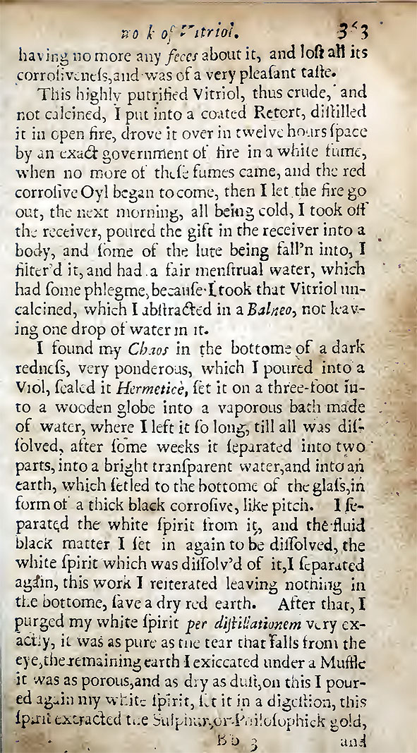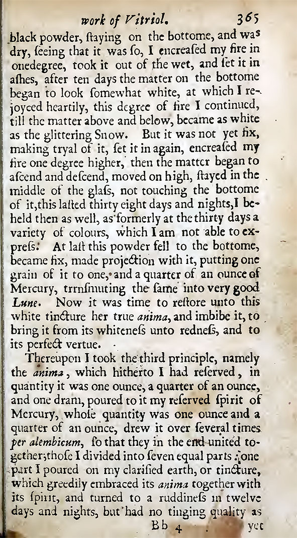 “It is necessary therefore to convert the bodies of metals into a fluid substance; for that every tincture will tinge a thousand times more in a soft and liquid substance, than when it is in a dry one, as is plainly apparent in saffron. Therefore the transmutation of imperfect metals is impossible to be done by perfect bodies, while they are dry and hard; for which cause sake they must be brought back into their first matter, which is soft and fluid. It appears therefore that the moisture must be reverted that the hidden treasure may be revealed. And this is called the reincrudation of bodies, which is the decocting and softening them, till they lose their hard and dry substance or form”