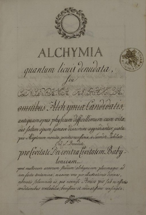 ALCHIMIE. Cod. 35/34 - BASILIUS MATZKE. „Alchymia quantum licuit denudata ... a sacerdote jubilato O. S. B. pro civitate dei contra civitatem Babylonicam … conscripta.“ ist das Produkt der beinahe 50 Jahre andauernden alchimistischen Studien des P. Basilius Matzke. Die Abschrift mit Federzeichnungen wurde von P. Placidus Sartore angefertigt.