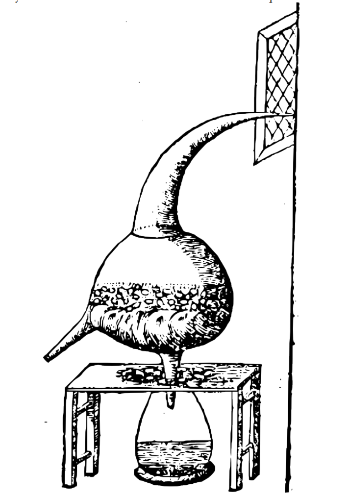 I do not want to forget to say here that some philosophers mixed the crystals with the first raw material, they made pellets and distilled them, as we said above from the earth, which being done, they saw descend into the container the earthly spirits of dark color, and the celestial spirits of red color like blood, which water they also called double philosophical mercury but in liquid and humid form, ditto milk of the virgin, very sour vinegar.