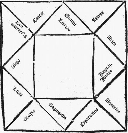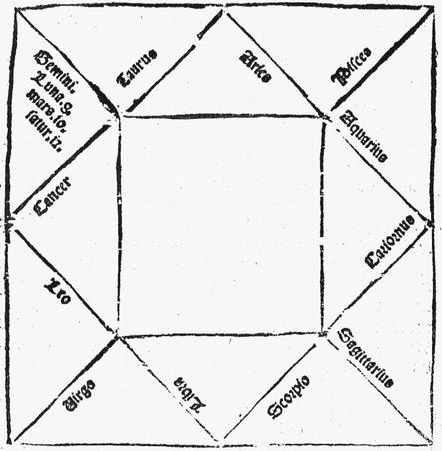 Likewise, a planet that is in the beginning of Aries beholds the one that is in Gemini before it, and the one that is in Aquarius after it. It also beholds the fourth before it and the fourth after it, which is the tenth; and this aspect is called the square, because it holds the fourth part of the circle, that is, 90 degrees.