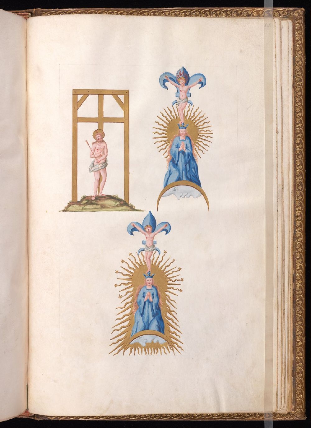 So he is sun moon, she is in him an eternal body together sol puritas, aurum luna charitas argentum mars mors humilitas ferrum sanguis mercurium sanctitas argentum vivum Jovis castitas stannum venus pietas cuprum, saturnus sobrietas plumbum; to know naturally the figures and paintings of this book Jesus Christus sol speculum trinitatis has them all in him his virgin luna Maria, the moon was made from the sun of the highest and holy trinity Jesus Christi; the moon Mary, made in her true sun which is God Jesus Christus will remain there everywhere eternity; a body in her son, who is his father Jesus Christus, more sensitive, than we have written here in the parable of the unique natural sun.