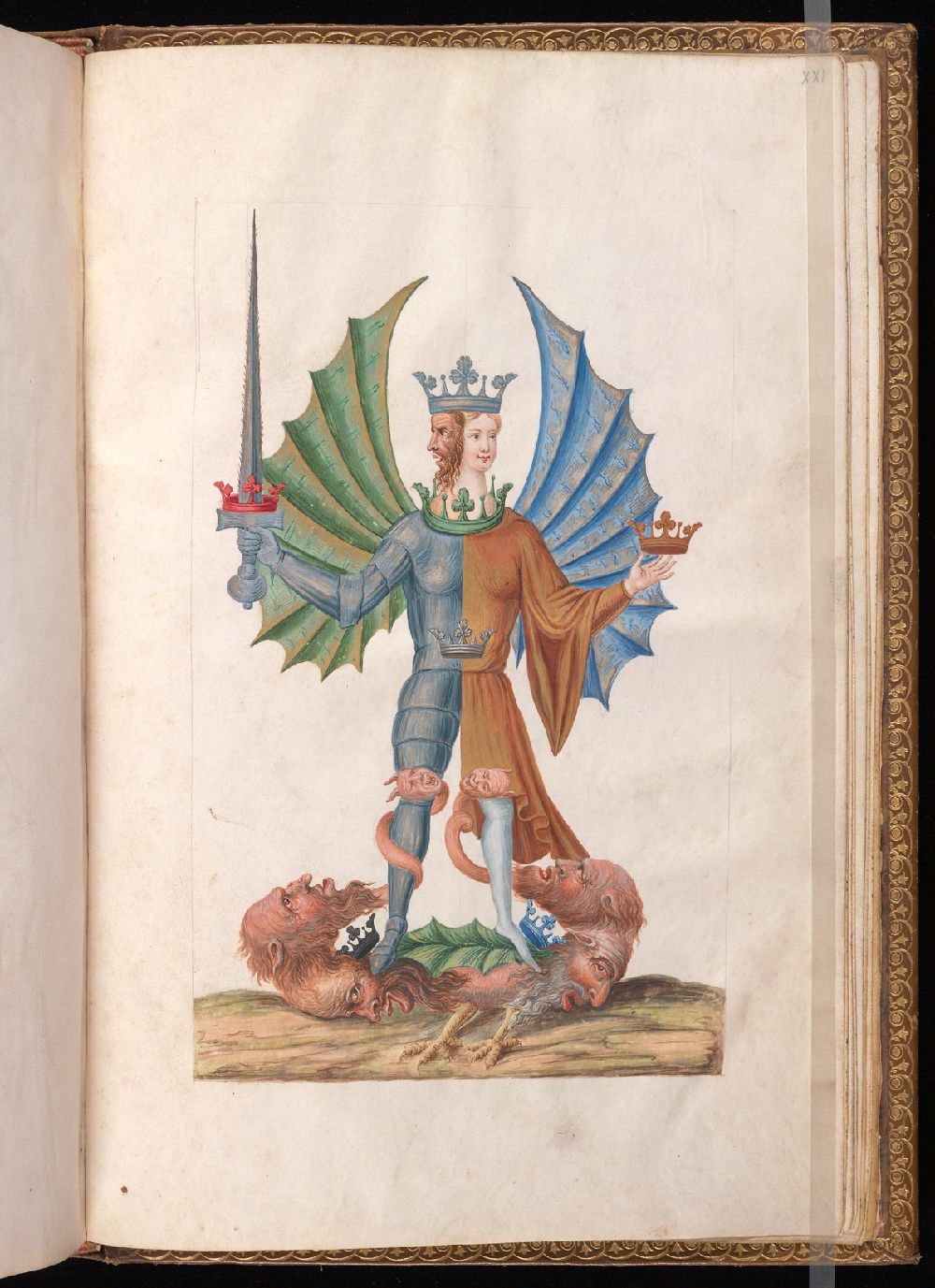 Cuivre Vénus vif est joyeuse chair de la piété la couronne du corps de Dieu ange, soleil air vertes le jour Vénus, la planète est E.M.R. la quatrième, plomb, Saturne mort vivant est en crainte joyeux sang chair de la sobriété la couronne au pied droit de Dieu aigle, soleil, terre pesante, noir le jour Saturne la planète est E.M.R. la cinq, or, Soleil, lune argent il les a tous en soi à sa femme la lune, toutes les planètes et les sept couronnes parfaites.