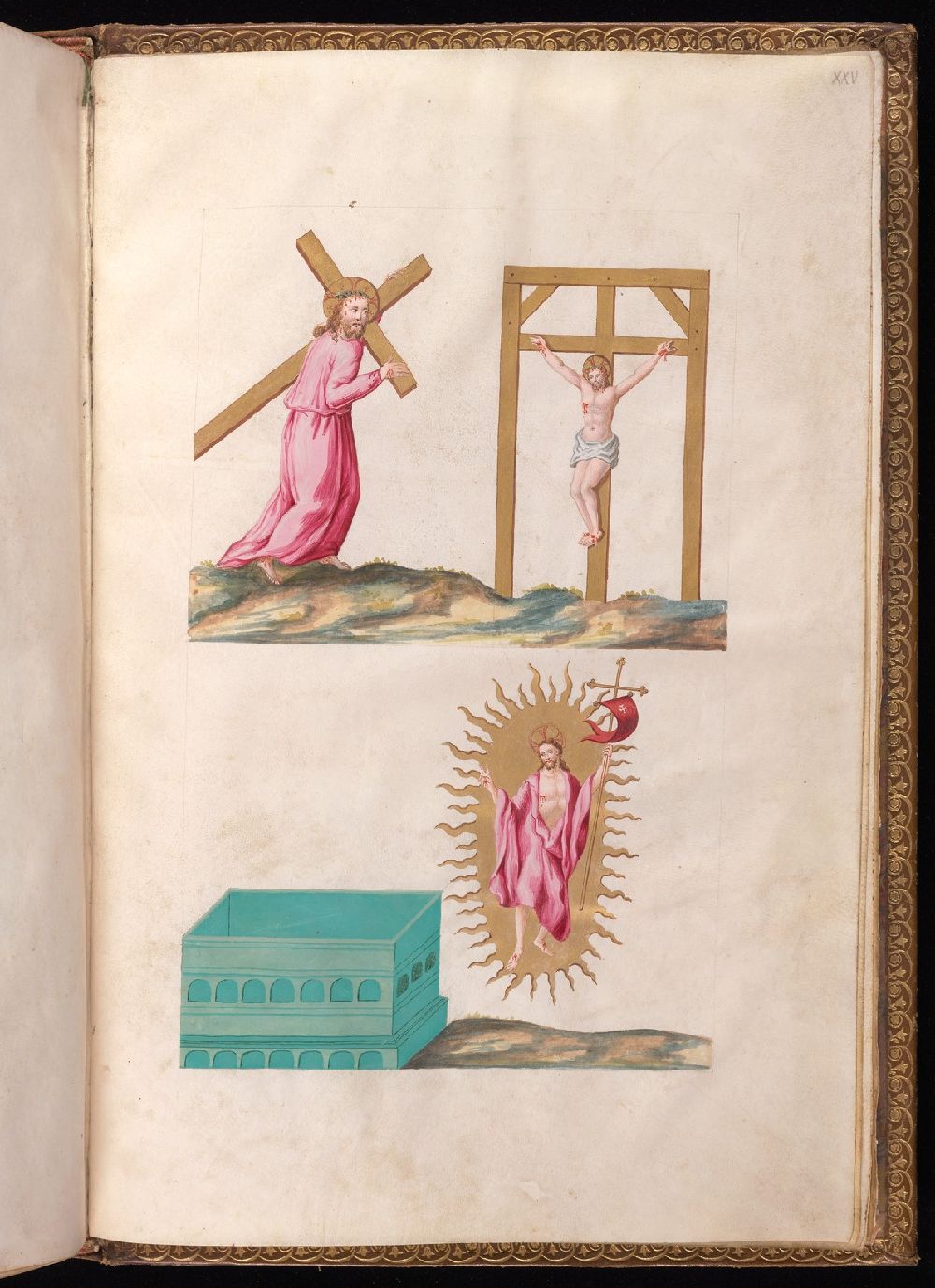 This justice marks us Mary human nature Jesus on the wheel the holy trinity Jesus Christ was lying on the stiff line and extended like a pane of glass in height in depth, head, feet, which has oblong angles, he is extended from both hands up and down the blunt nails pierced the bloody flesh of his legs the spear cut his side he feels it all for us on his body C.K.R.