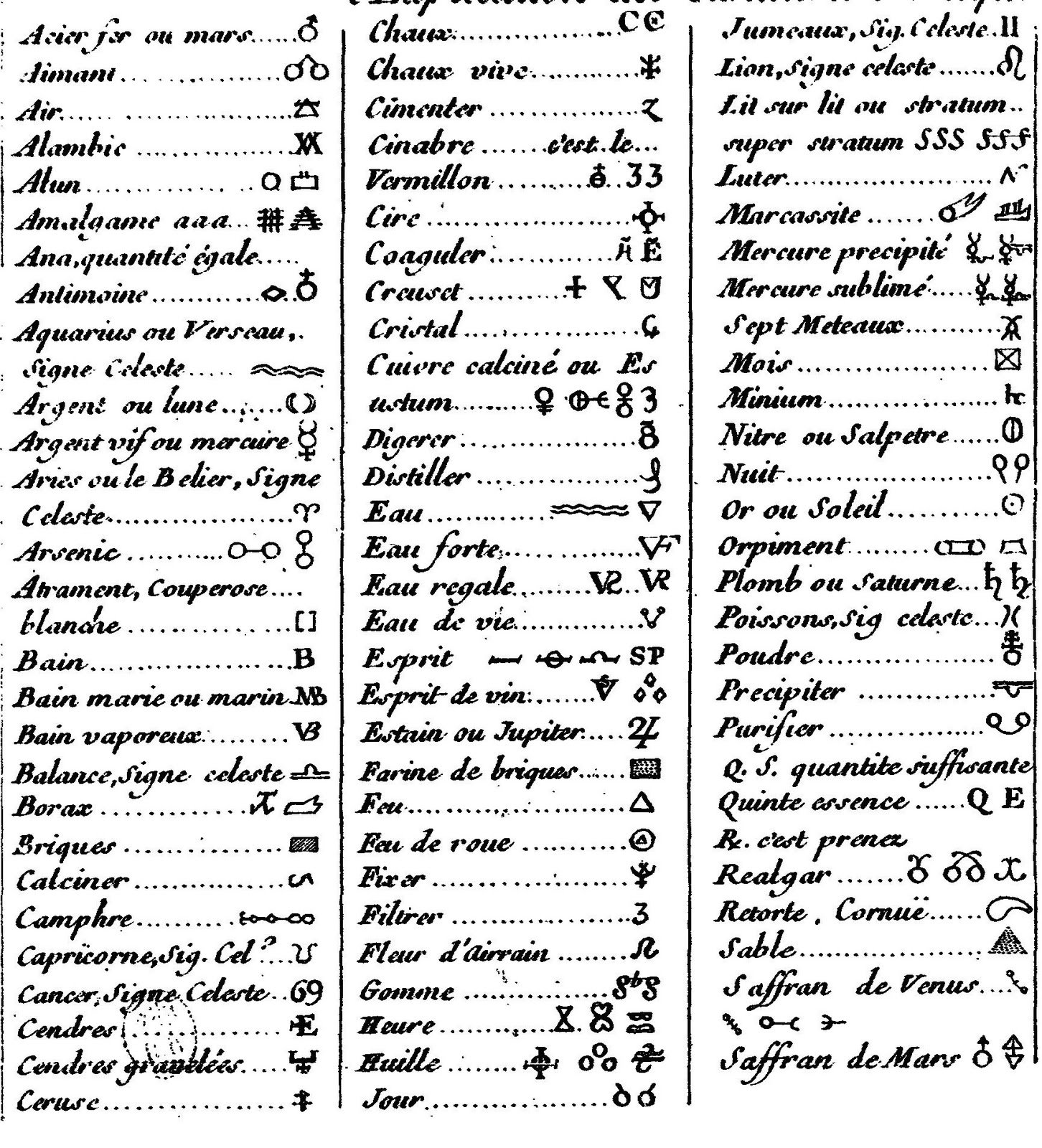 As the ancient Sages hid the secrets of nature under shadows and obscurities, lest the ignorant vulgar profane the sacred Philosophy; the Hermetic Philosophers, who are the Chemists, have used it in the same way so as not to make their science common, and not to profane the admirable mysteries it contains: that is to say, they have made use of hieroglyphic marks and characters, as well as some terms which are unusual to others, to express many things, which are of the essence of the theory or practice of their art. Which is why we have judged it appropriate to explain, as much as we can, what these obscure marks and terms signify, so that when those curious about Chemistry come across them in ancient or modern Authors,