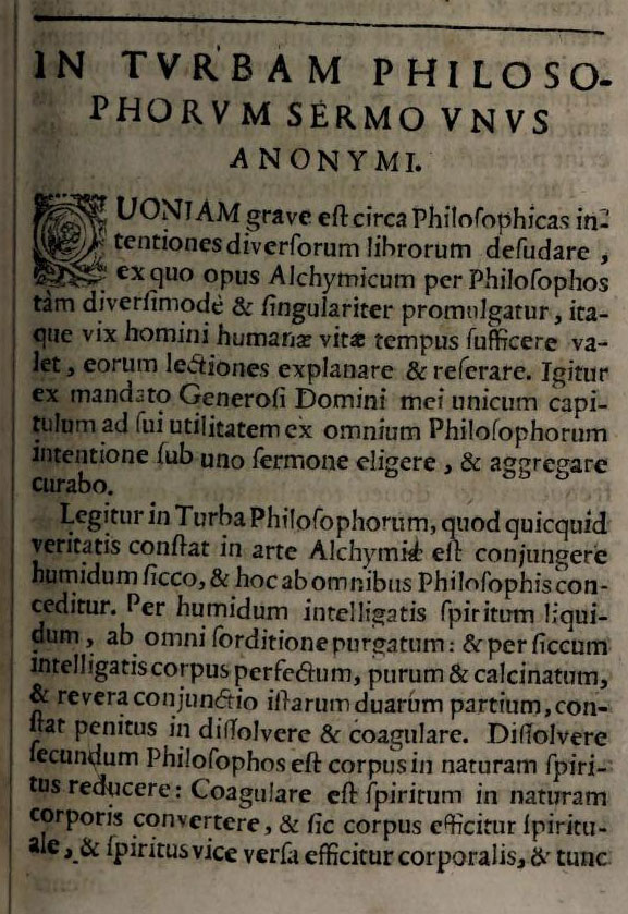 In Turbam Philosophorum Sermo unus Anonymi - A single discourse on the Turba Philosophorum, by an anonymous.