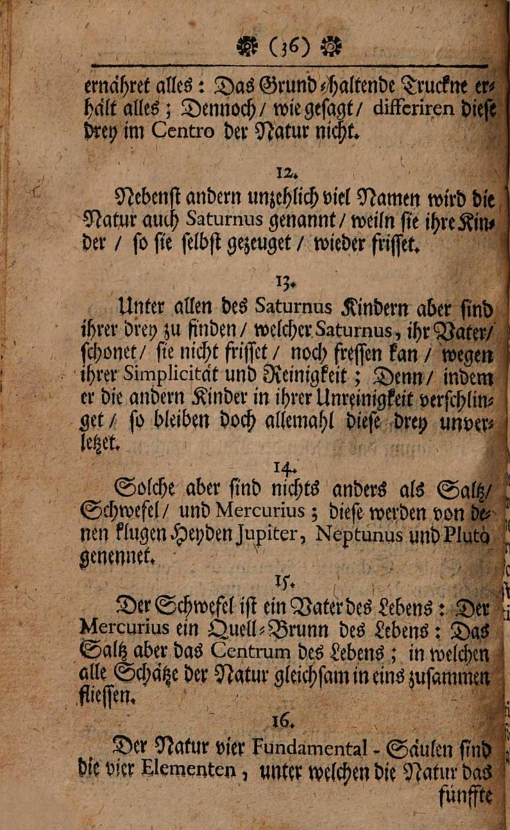 In addition to all this, old Saturnus will give you a highly lustrous Mineram, in which all Metals have grown from the first Matter in his mountain, in which this noble tinctural Sulphur solare can often be found, if only you are able to extract it and then use it properly.