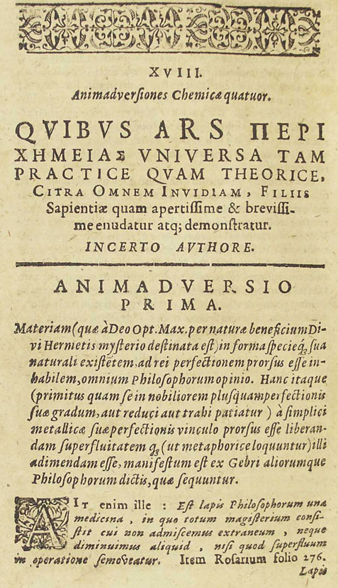 The material (which by the benefit of nature ordained by God, the Best and Greatest, for the divine mystery of Hermes, exists in its own natural form and species) is, in the opinion of all the philosophers, altogether unsuitable for its perfection. And therefore this, since it suffers either to be reduced or drawn first into a more noble state than that of its own perfection, must be altogether freed from the bond of its metallic perfection, [and] the superfluity belonging to it (to speak metaphorically) must be removed from it, as is clear from the sayings of Geber and of other philosophers which follow.