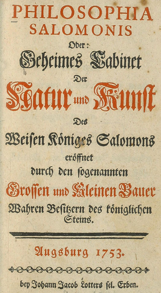 Philosophia Salomonis, oder Geheimes Cabinet der Natur und Kunst des weisen Königes Salomons : eröffnet durch den sogenannten grossen und kleinen Bauer, wahren Besitzern des königlichen Steins