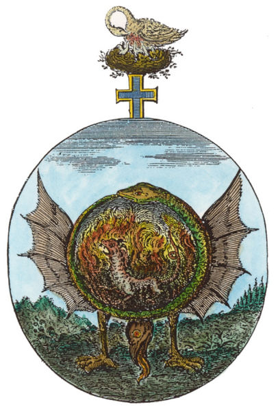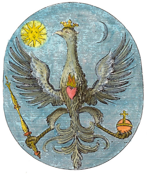 Fire is the energy for implementing and completing all Alchemical Work. Fire and heat instantly changed the swan to a Salamander. Dry mystical Fire was used in the earlier part of the Work. Now the moist physical Fire at steady heat builds up, maintains, and cools the mystical Fire. The mystical Fire is called the blood of its own Fire-Embers, appearing in Figure 12 beneath the pelican.