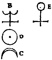 But the third figure which is denoted by B, is not so easy for everyone to know. And it must be considered very carefully that these known forms, D and C, show themselves as separate and distinct essences from this figure B; and secondly, that we see the horns of figure C, turned downwards as towards the earth; and that this part of D which illuminates this same C is also turned towards the earth, that is to say below, in the center of which alone is visible the truly terrestrial point: and that finally these two figures D and C, turned towards the lower parts, form, better than B, its hieroglyphic index (of the Earth). So the earth can hieroglyphically represent stability and fixation to us.I therefore leave to conclude from this what are C and D. Hence we can now note a great secret: know; how all the things that we have said in the first place of the Sun and the Moon can here receive a more perfect and quite necessary interpretation, these two stars having hitherto been placed at the upper part, and the lunar horns erected above. But we have spoken enough on this subject. We will therefore now examine according to the foundations of our hieroglyphic art, the nature of this third figure (B). First, we see her carrying a double crescent Moon at the top, which is our Aries (but mystically turned around). Then the hieroglyphic sign of the Elements is appended to it.As for what relates to the redoubled Moon, this can be explained (according to the matter proposed): a double degree (gradus) of the Moon. Let us therefore speak of these grades which experienced physicists can only find four in number among all the created substances; to know: to be, to live, to feel and to understand (esse, vivere, sente ei intelligere). And noticing that the first two of these grades are found here, we shall thus say: the existing and living Moon. Some determine all life by movement; now, there are six principal species of movement. And the Cross that is added indicates that the artifice of the Elements is required here.Also, since we have reported very often in our theories that the hieroglyph of the Moon is like a semicircle, on the other hand, the whole circle signifies the Sun. Now, here, we have two semi-circles, but separated (united however at the common point) and which, if they are combined (as they can be by a certain art), can represent to us the circular plenitude of the Sun. From all these things considered together, it appears that we can here, summarily and hieroglyphically, utter the following sentence: The existing and living Moon which must be treated (tractanda) by the magisterium of the Elements possessing the power to represent the solar plenitude by its two semicircles joined together by a secret art.Let this circle (of which we have spoken) which we designate in the figure by the letter E, be therefore completed and formed. Let us therefore remember first that this solar degree was not presented to us by nature; but that it is artificial and factitious, and that it first offered itself to us in its first aspect and according to its proper nature (as in B) in two separate and dissolved parts, and not solidly reunited in the solar form. Finally the semi-diameter of these semi-circles is not equal to the semi-diameter of D and C (as we have formed them and as everyone can see), but much smaller.From which it is clear that this same B is not of such great amplitude as D and C are. And E itself confirms this very well for us, having, by this means, transformed itself into a circle, from B into the figure E. Then, then, the sole character of Venus arises before our eyes. - We have already demonstrated by these hieroglyphic syllogisms that from B we cannot obtain the true D, nor could the true C have been completely in the nature of B; hence this could not have been the true living moon.You can therefore already doubt about this life and this movement, if they possess them truly and naturally, however, as we have already explained to the sages, all the things which are said (about B) in a similar way, will be at least analogical, and all that we have briefly taught concerning C and D is very well suited, but analogically, to this same B, accompanied by its elements. And even what we add on the nature of Aries must exactly suit this one, since it carries (B) this figure (although inverted) at its top, and it is added to this same B which is the mystical figure of the Elements.You can therefore already doubt about this life and this movement, if they possess them truly and naturally, however, as we have already explained to the sages, all the things which are said (about B) in a similar way, will be at least analogical, and all that we have briefly taught concerning C and D is very well suited, but analogically, to this same B, accompanied by its elements. And even what we add on the nature of Aries must exactly suit this one, since it bears (B) this figure (although inverted) at its top, and it is added to this same B which is the mystical figure of the Elements.You can therefore already doubt about this life and this movement, if they possess them truly and naturally, however, as we have already explained to the sages, all the things which are said (about B) in a similar way, will be at least analogical, and all that we have briefly taught concerning C and D is very well suited, but analogically, to this same B, accompanied by its elements. And even what we add on the nature of Aries must exactly suit this one, since it bears (B) this figure (although inverted) at its top, and it is added to this same B which is the mystical figure of the Elements.all the things that are said (about B) in a similar way will be at least analogical, and all that we have briefly taught concerning C and D is very well suited, but analogically, to this same B, accompanied by its elements. And even what we add on the nature of Aries must exactly suit this one, since it bears (B) this figure (although inverted) at i