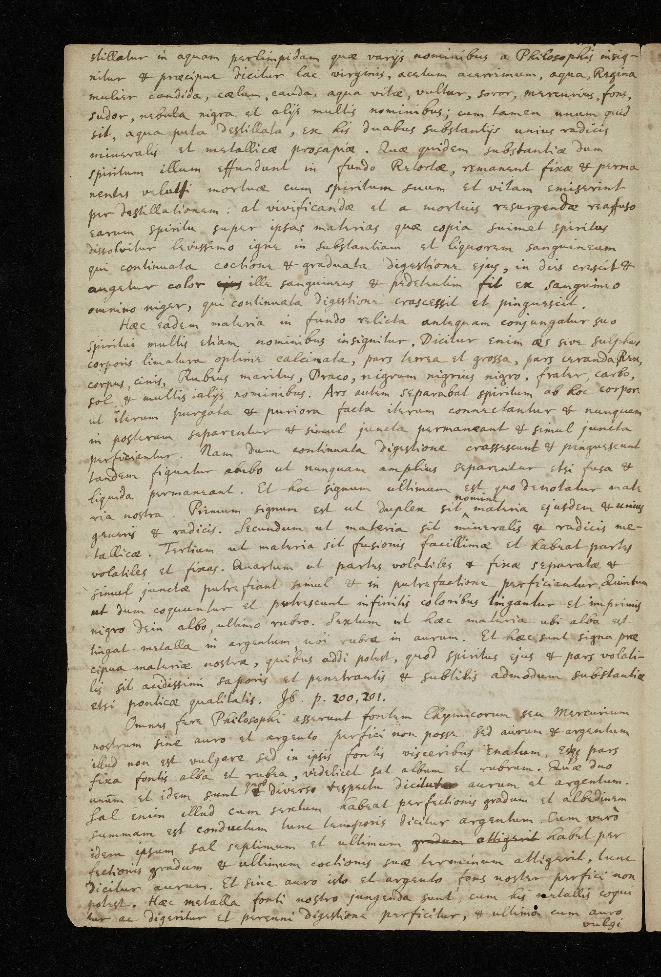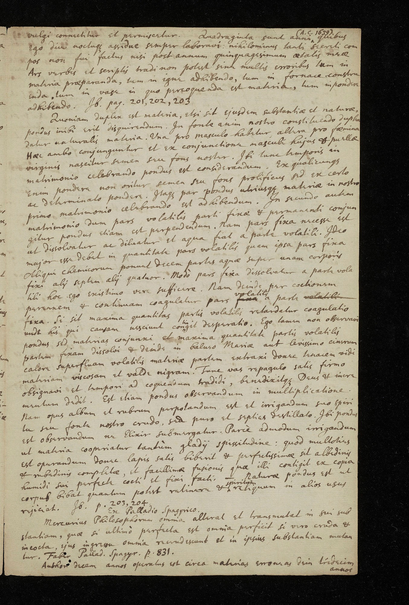 vulgi connectitur et permiscetur. Quadraginta sunt anni [[insertion]] (A.C. 1639) [[/insertion]] quibus ego dice [[noctuqs?]] assidue semper laboravi nihilominus tanti secreti com pos non fui factus nisi post annum quinquagesimum æsatis meæ Ars verbis et seriptis tradi non potest sine multis erroribus [[tum?]] in materia præparanda, tum in igne adhibendo, tum in fornace constra enda, tum in vase in quo percoquenda est materia, tum in pondese adhibendo. Jb. pag. 201, 202, 203