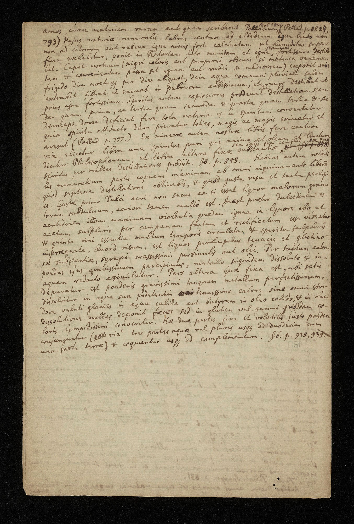 …years upon the [[oeram?]] matter before he wrote the Palladium [[insertion]] ^ [[A.V.S?]] 1624 [[/insertion]] (Pallad. p. 8828), 793). He takes one hundred pounds of this mineral matter, calcined to whiteness with a gentle fire—not to citrine or red with too strong a fire—so that the superfluous moisture may exhale; he puts it into a retort fortified with lute and distills with a very strong fire [[insertion]] ^ of flame [[/insertion]]. The caput mortuum (of black color, or of dark purple if the material has undergone a vehement and [[convenientum?]] suitable fire, or of red if a moderate one) he exposes to cold [[aeir?]] air for a long time, [[nochiqs?]] for several days; then with common rain-water he extracts the salt, filters it, and dries it into a most white powder; [[iterumqs?]] he distills again as before with very strong fire. And the spirits come forth more copiously in [[insertion]] [[hac?]] [[/insertion]] the second distillation than in the first, and the third than the second, and the fourth than the third, and so on, until almost all the matter fails and is converted into spirit—because, as it is so often deprived of the spirit drawn off, it is dried out and parched more and more. (Pallad. p. 777.) Moreover, from almost one hundred pounds of our ore scarcely one pound of pure spirit is elicited, which is called the soul and the oil and the tincture of the Philosophers; and another pound of fixed substance [[insertion]] ^ or of fixed waxy salt [[/insertion]] [[strikethrough]] Je. (Jb. p. 858 ex [[qua?]]) [[/strikethrough]] from which the spirit comes forth through many distillations. (Jb. p. 858.)