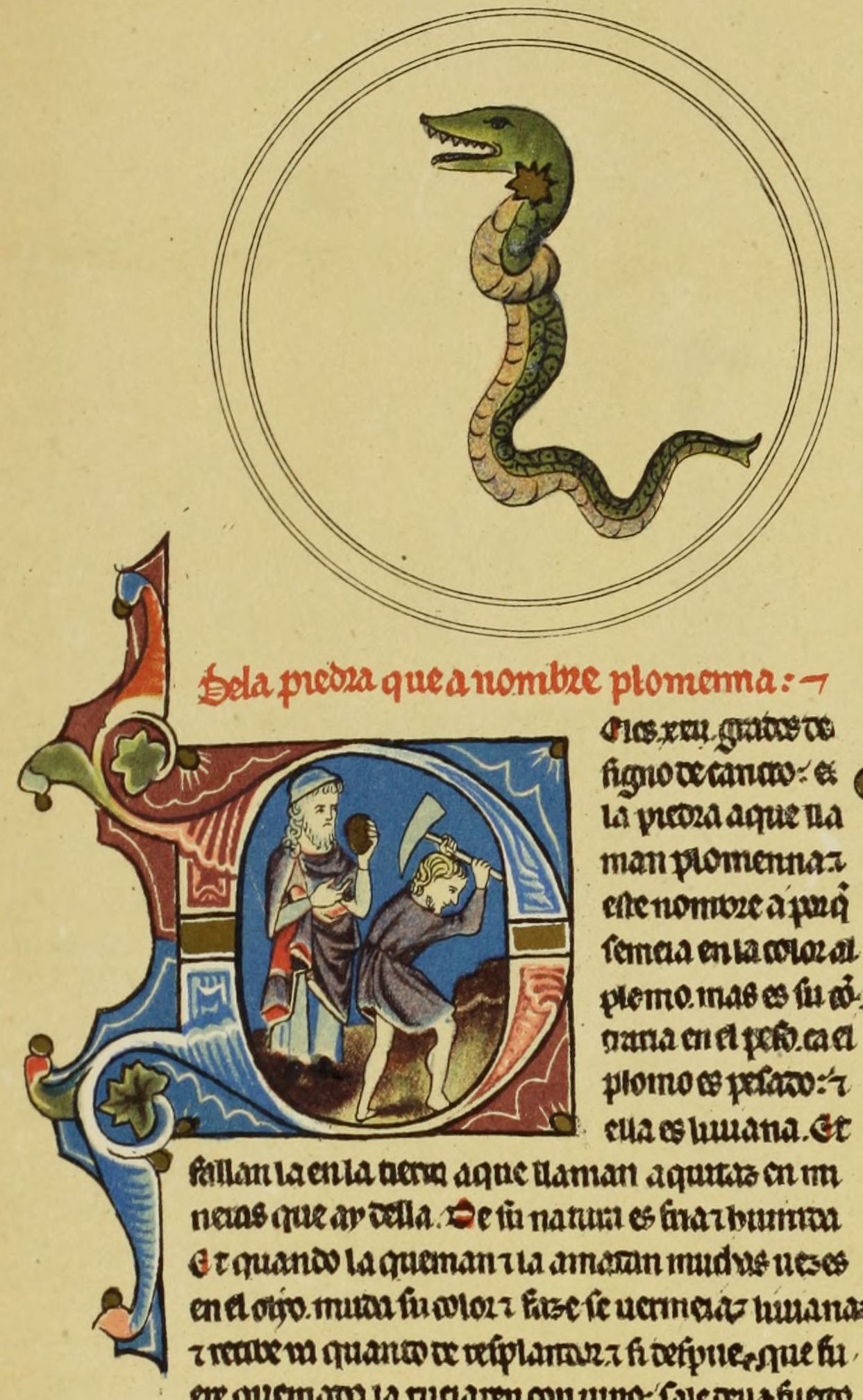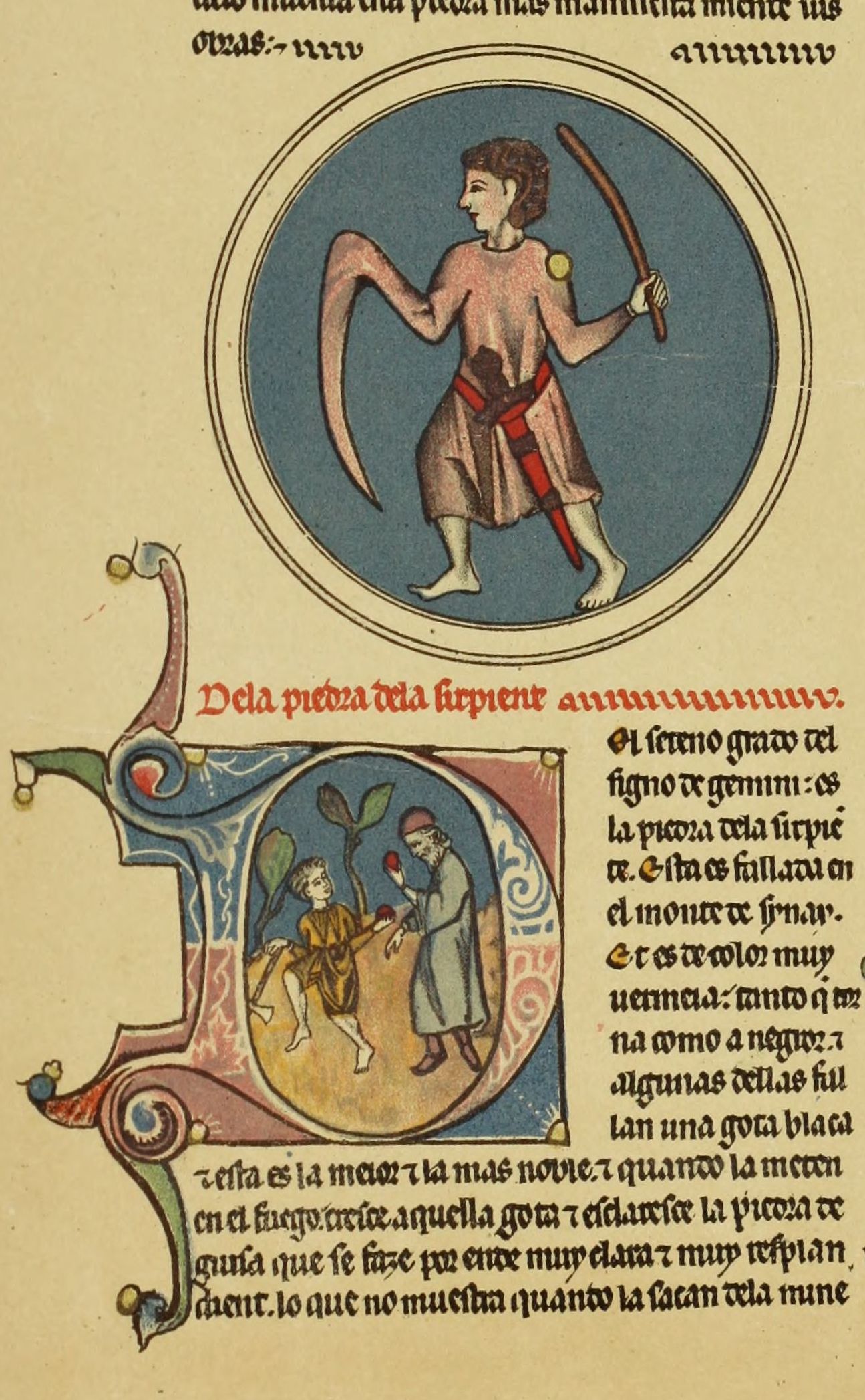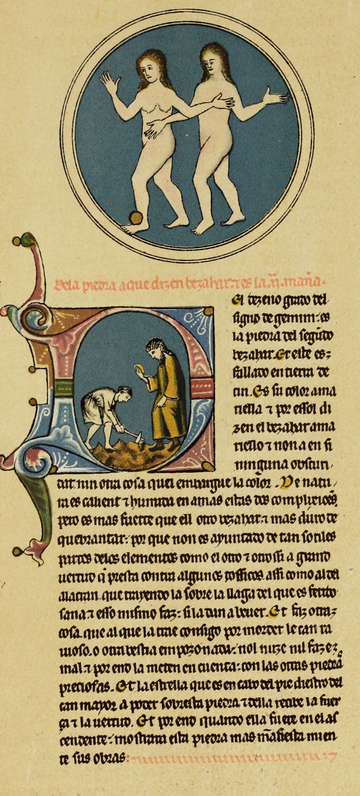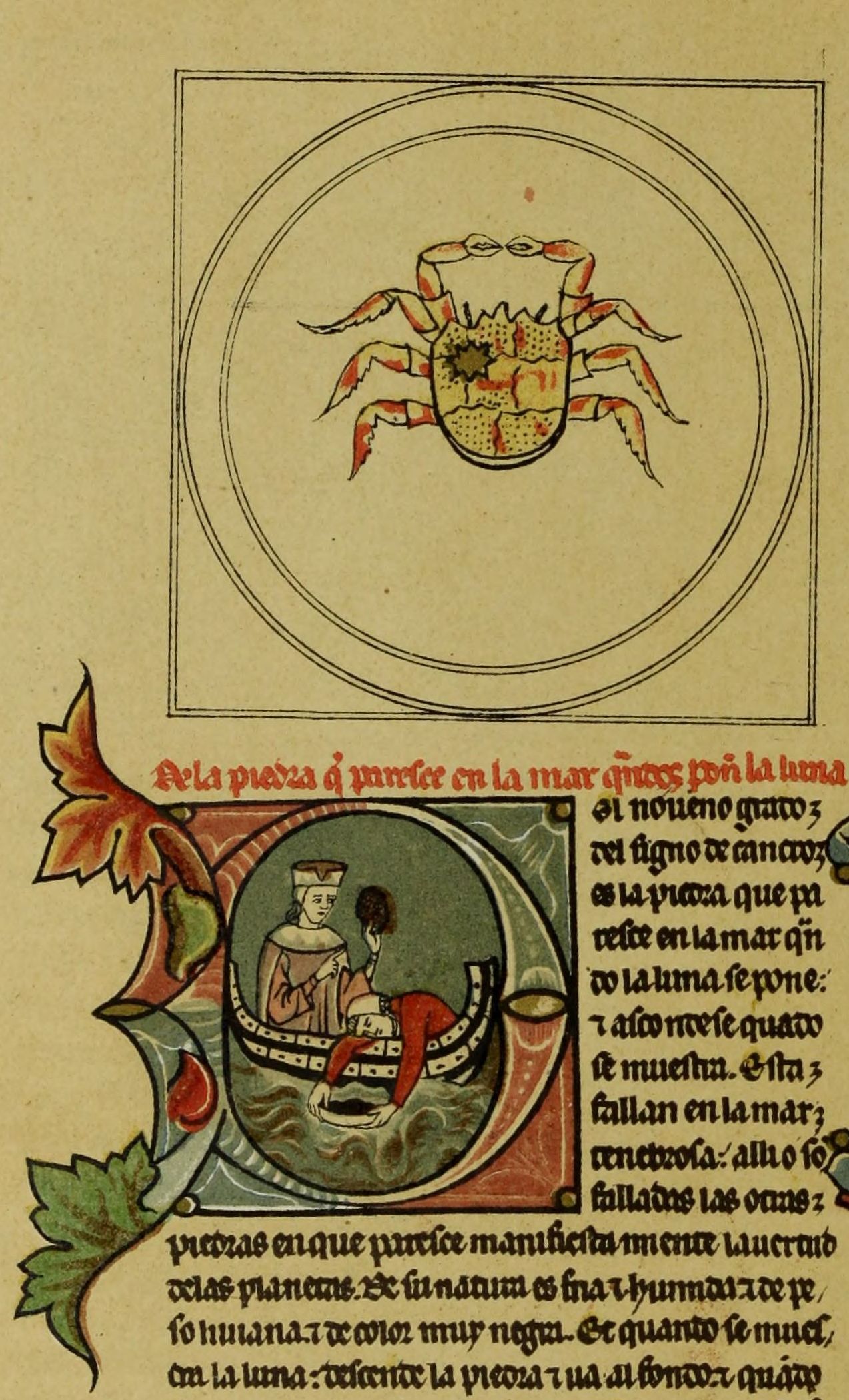 This important lapidary preserved at the Library of the royal site of Saint-Laurent-de-l'Escurial, richly illustrated and taken from Greek and Arabic sources, was translated from Arabic and perhaps augmented for Alfonso X of Castile by his medicine and astrologer Yehuda Mosca. It was originally, at least in its original form and if we are to believe the explanations in the first chapters, written in Syriac.