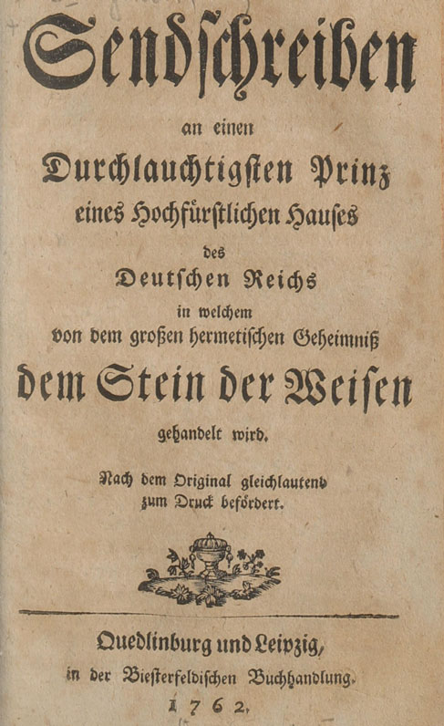 Sendschreiben an einen Durchlauchtigsten Prinz eines Hochfürstlichen Hauses des Deutschen Rechs in welchem von dem großen hermetischen Geheimniß dem Stein der Weisen gehandelt wird : Nach dem Original gleichlautend zum Druck befördert. / [von Frydau]