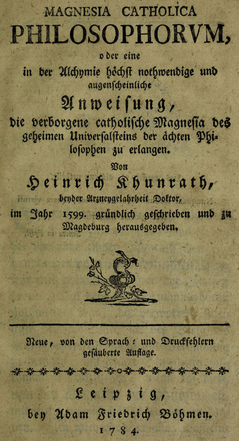 Magnesia catholica Philosophorum, oder eine in der Alchymie höchst nothwendige und ausgenscheinliche Anweisung, die verborgene catholische Magnesia des geheimen Universalsteins der ächten Philosophen zu erlangen / von Heinrich Khunrath im Jahr 1599 gründlich geschrieben und zu Magdeburg hrsg.