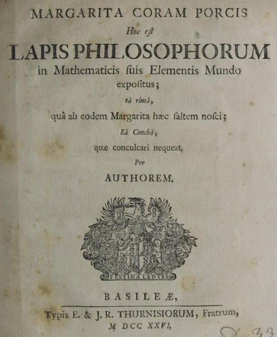 Margarita Coram Porcis Hoc est Lapis Philosophorum in Mathematicis suis Elementis Mundo expositus; eâ rimâ, quâ ab eodem Margarita haec saltem nosci; Eâ Conchâ, quae conculari nequeat, Per authorem