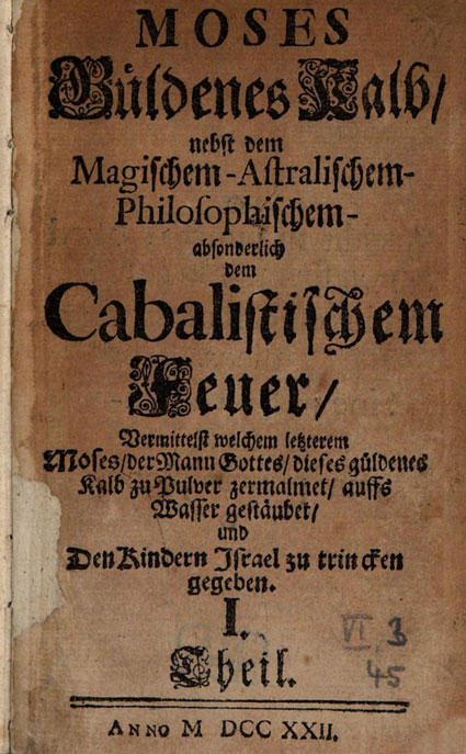 Moses Güldenes Kalb nebst dem Magischem-Astralischem-Philosophischem- absonderlich dem Cabalistischem Feuer, Vermittelst welchem letzterem Moses, der Mann Gottes, dieses güldenes Kalb zu Pulver zermalmet, auffs Wasser gestäubet, und Den Kindern Israel zu trincken gegeben - Tom 1