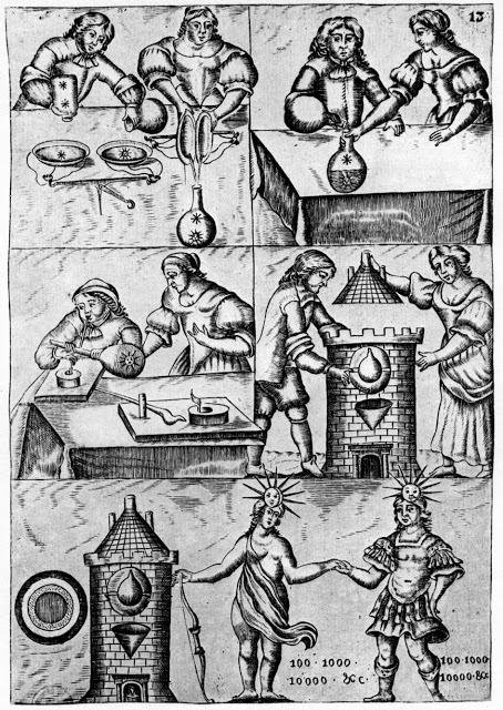 The thirteenth plate is a repetition of the tenth, for in the Work all the operations follow one another and look alike; but this new conjunction, which takes place with matters sublimated to the extreme, is nothing other than the beginning of the multiplications. The work is the same as that of plate ten and, in the coction, we will see the colors reappear. The duration of this decreases as the multiplicative power increases, so that in the end it only takes a day to obtain the result which, at the beginning, required months. The figures of this plate give the powers of transmutations obtained by the subsequent coctions.