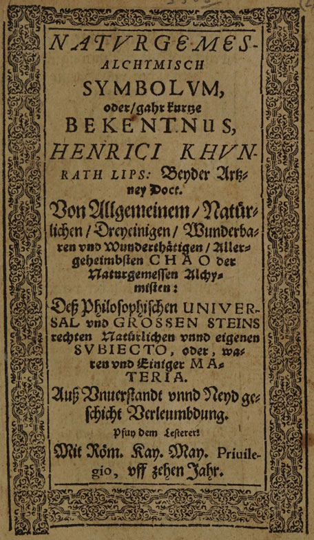 Naturgemes-alchymisch symbolum, oder, gahr kurtze Bekentnus ... von allgemeinem, natürlichen, dreyeinigen, wunderbaren, und wunderthätigen, allergeheimbsten Chao der naturgemessen Alchymisten: desz philosophischen universal und grossen Steins rechten natürlichen unnd eigenen Subjecto, oder, waren und einiger Materia / [Heinrich Khunrath].