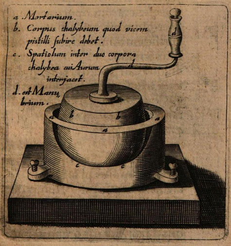 Accordingly, gold, beaten into leaf as required and cut into the smallest particles, is placed in a very dense glass mortar (or a golden one), of the kind which the most august King FREDERICK of Denmark, of blessed memory, shortly before his death had caused to be made at the urging of Borrhius, as soon as this operation was first introduced in these parts. Into it the gold is put, and, the mortar being covered only with paper so that no dust or other thing may fall in, it is ground night and day with the mill kept in continuous motion, until it is converted into a brownish-black powder; for which grinding fourteen days is for the most part required, fourteen days must be spent at it; but if one wishes to work only by day, a whole month will be required.