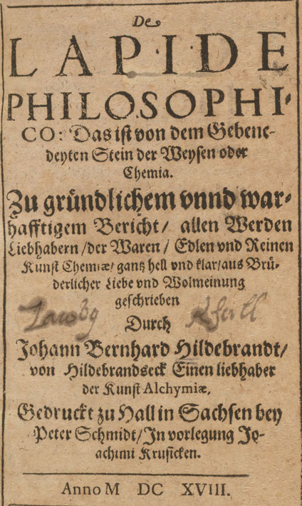 De lapide philosophico, das ist, Von dem Gebenedeyten Stein der Weysen oder Chemia : zu gründlichem vnnd warhafftigem Bericht, allen Werden Liebhabern, der Waren, Edlen und reinen Kunst Chemiae, gantz hell vnd klar, aus brüderlicher Liebe und Wolmeinung geschrieben / durch Johann Bernhard Hildebrandt, von Hildebrandseckt einen Liebhaber der Kunst alchymiae