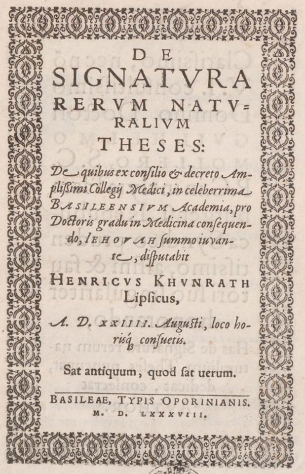De signatura rerum naturalium theses / De quibus ex consilio & decreto Amplissimi Collegij Medici, in celeberrima Basiliensium Academia, pro Doctoris gradu in Medicina consequendo, Iehova summo iuvante, disputabit Henricus Khunrath Lipsicus. A. D. XXIIII. Augusti, loco horisque consuetis