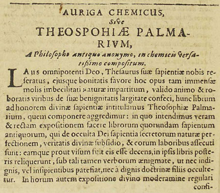 Thanks be to almighty God, by whose treasury of wisdom this work has been brought back to us, and by the favor of whose goodness this work, imparted to the weakness of nature in so vast a mass, has been completed with a strong mind and the robust powers of His generous bounty. Therefore we now undertake to compose the little book entitled The Palm of Theosophy, in honor of divine wisdom, in which we intend to make a true and right exposition of certain books of the ancient wise men, who by the perfection of the secrets of nature’s hidden wisdom, under the guidance of divine truth, attained it by their labors.