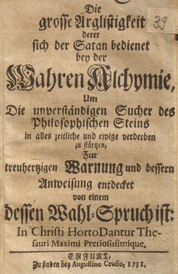 Die grosse Arglistigkeit derer sich der Satan bedienet bey der Wahren Alchymie, Um Die unverständigen Sucher des Philosophischen Steins in alles zeitliche und ewige verderben zu stürtzen
