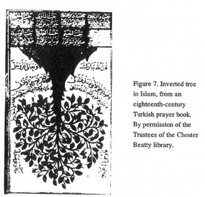 The concept of the Indo ‑ Aryan inverted tree is found among Lapp shamans, Islam, the Kabbalah, various European alchemical texts, and in the writings and illustrations of Robert Fludd, Jacob Boehme, and John Dee. The inverted tree is found even in Plato's Timaeus: "That part (soul) which we say dwells in the summit of our body and lifts us from earth towards our celestial affinity, like a plant whose roots are not in earth, but in the heavens ."(7) It is this inverted inner divine power that keeps the physical body upright (Fig. 7).
