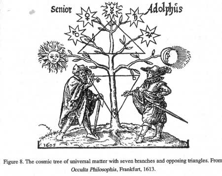 Knowledge of the alchemical procedures found in the Rig Vedic soma ceremony have been incorporated directly into European alchemical treatises, which accounts for many of the similarities found in Indian religion and European alchemy. Many of the different routes by which Indian cosmological ideas were passed on to Greek, Jewish, and Islamic philosophers have been discussed in chapter 6. These philosophers in turn influenced the writers of European alchemical texts. Before proceeding to discussions of European elixir theories, the philosophers' stone, and the alchemical structure of the soma ceremony, let us examine, in more detail, the symbols of the inverted tree and the seven-pointed star body .