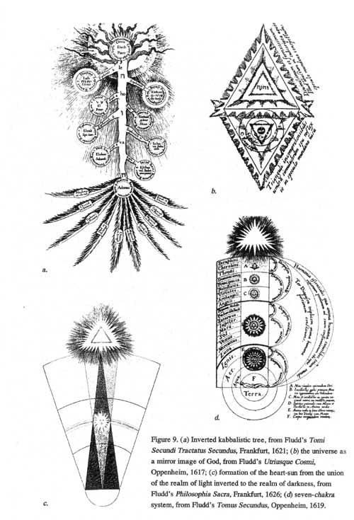 Most of Fludd's works are in Latin. But one major book, his Mosaicall Philosophy, is in English. Several other texts have been translated into English. There have also been several detailed English studies of his entire corpus. Fludd had detailed illustrations showing his cosmological system made for most of his books. From a careful observation of his cosmological diagrams we can clearly see correspondences with Indian cosmology. Some similarities include the inverted kabbalistic tree as the downward spiral of creation (Fig. 9a). The created universe of matter is shown as a mirror image of heaven. In his Utriusque cosmi historia, Fludd says that the cosmological structure of the universe is like upward and downward triangles (upright and inverted trees) that are mirrored through the medium of the "watery world"(23) (Fig. 9b). This image is identical to that in the Rig Veda, in which the primal waters that separate the heavenly world of light above from the manifested world of matter below act as a mirror, the medium of the cosmic waters in which the two worlds are inverted. We see the union of the world of light with dark matter as a union of opposites that creates the solar heart. Fludd shows the embryonic creation of the sun. Fludd's system contains the central sun as the solar heart, formed from two inverted triangles (Fig 9c). The seven chakras are shown aligned with the creation (Fig. 9d). We see the union of the world of light with dark matter as a union of opposites that creates the solar heart. Fludd shows the embryonic creation of the sun. Fludd's system contains the central sun as the solar heart, formed from two inverted triangles (Fig 9c). The seven chakras are shown aligned with the creation (Fig. 9d). We see the union of the world of light with dark matter as a union of opposites that creates the solar heart. Fludd shows the embryonic creation of the sun. Fludd's system contains the central sun as the solar heart, formed from two inverted triangles (Fig 9c). The seven chakras are shown aligned with the creation (Fig. 9d).