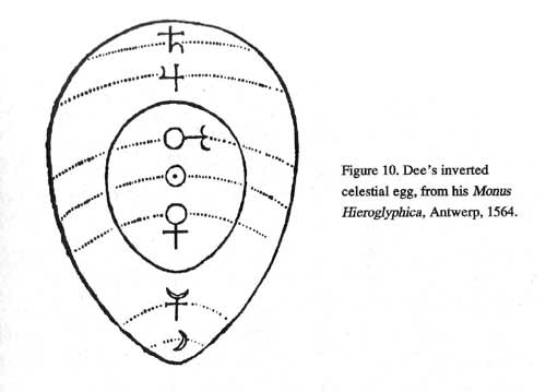 John Dee (1527 - 1608), magician, mathematician, alchemist, and Kabbalist, used the same sources in constructing his cosmology and in developing his ideas about magic. In Dee's Monas hieroglyphica we find seven stages in the cosmological work. He shows the celestial philosophers' egg as containing all creation within it. It is depicted as a downward - pointing egg shape. This suggests the inverted - tree cosmology related to the cosmogonic egg (Fig. 10).