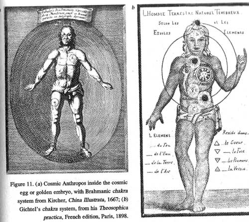 Fludd, Boehme, and Dee could have obtained all their information from kabbalistic and alchemical texts, which already contained Indian influences. But a closer source would have been the book Ein missionsgeschichtlichen Beitragzum Christlichen Dialog mit dem Hinduismus, written by the Jesuit Robert de Nobili (1577 ‑1656). This book contained a section on the "Theology of the Brahmans." Nobili was a missionary at Madural and Malabar. His book was published and possibly passed around in manuscript form during Boehme, Fludd, and Dee's lifetime. Although it is doubtful that Boehme would have encountered it, it may have been told to him or incorporated into other books he could have read. There is little doubt that this book, plus one other, China Illustrata by Athanasius Kircher, published in 1667, had an important impact upon Boehme's disciple, Gichtel. These two books are the probable sources of Indian ideas on the chakras, which Gichtel incorporated into his mystical system. Fludd's chakra system was probably also influenced by Nobili's book.-Sukta hymn that had been incorporated into various later Upanisads. This old hymn is partly the source of the original India chakra system. In Nobili and Kircher's works, fourteen centers are located within the primal man as Anthropos, from which the universe is created. Kircher provides an illustration (Fig. 11a) in his book that matches up in many places with Gichtel's chakra system (Fig. 11b), which can be found in his book, Theosophica practica, which was published in 1696 although the illustrations were added only in the 1736 edition. Six of Gichtel's seven chakras match Kircher's diagram. These are found between the waist and the top of the head. This also accounts for the inaccuracy of the location of the chakras in Gichtel's system as compared to authentic Indian texts. Gichtel is thought to have belonged to a secret society of Rosicrucians. He considered this information to be of a secret nature and kept the knowledge hidden for a number of years before publishing it. The subject of his book is mystic regeneration involving the chakras and the elixir vitae or soma.
