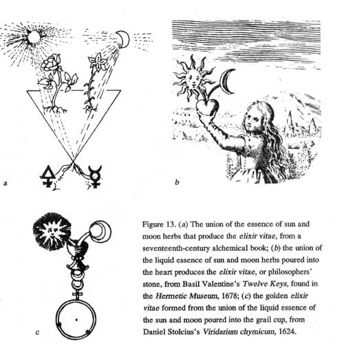 The tradition of uniting opposites is a very ancient one that dates back to sacrificial rituals to the gods, which were really magical and alchemical procedures combining herbal admixtures with ritualized stellar, lunar, and solar operations. These rituals were first systemized by the magi or fire - priests in the fire - cults of the Indo - Iranians. They combined their pneumatic fire rituals with the use of entheogenic drinks, and it was the Indo ‑ Aryans who fully developed their entheogenic drink called soma into the elixir vitae. The oldest such elixir vitae known was the sun and moon lotus drink prepared by the Asvins. It was composed of the saps of night ‑ blooming Nymphaea, moon plants, mixed with the day- blooming Nelumbo and Nymphaea, sun plants. Daniel Stolcius in his Viridarium chymicum, published in 1624, illustrates the preparation of this elixir vitae as the herbal juices of the sun and moon plants, which as John Read mentions, fill the holy grail cup with the "elixir of life" (Fig. 13c). This cup rests upon the sign of both mercury # and gold O, symbolizing the golden liquid state of the elixir within the cup of eternity.(42)
