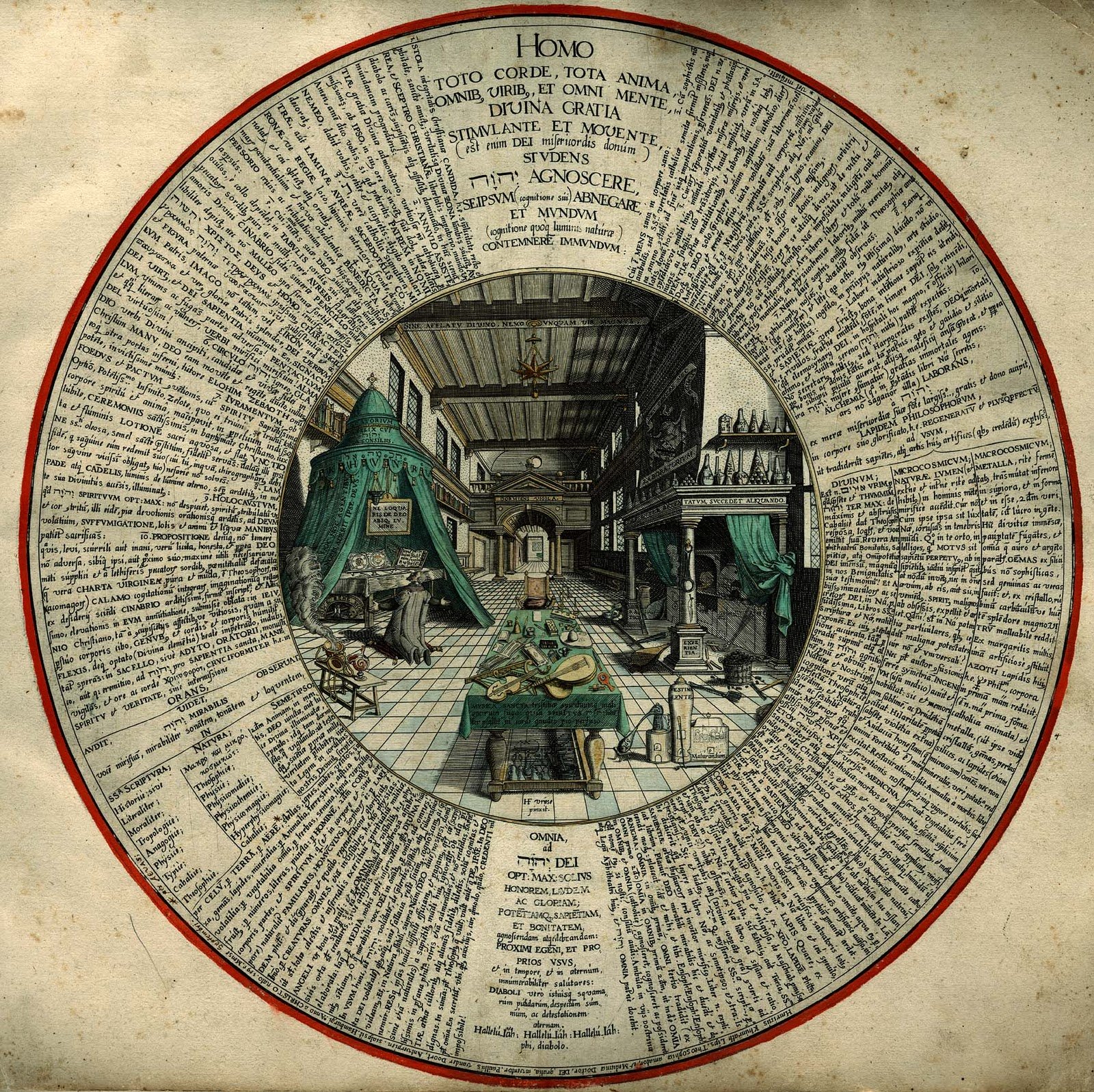 Per caelum, per terram, per aerem, ignes, nubes, uentos, saxa, gemmas, lapides, mineralia: per animalia, terrestria, aquatica et uolatilia: per uegetabilia omnia, per herbas, semina, ligna, uirgulta, fructus: per numeros, literas, puncta: per hominem, secundum corpus et corporis partes, and spiritum, qui (et in corpore et sine corpore) naturaliter familiaris, homunculusque sophorum est per lapidem philosophorum et dum praeparatum, et quando regeneratione glorificatus est. Immo, per creaturas omnes, etiam inuisibiles, hoc est non physicas, ut sunt, totae caelestis et infernalis exercituum spiritualium militiae, angeli uidelicet boni et mali: et per omnia, quae a uisibilibus, hoc est, physicis orta sunt creaturis, siue per se ea sunt naturalia, siue artificis manu industriosa affabre elaborata: tamquam per media, nobis apt inseruientia, quibus diuina humanitus sentiamus. O quam mirabilis uox Dei in omnibus, per omnia, ad omnes! In usum hunc, ut yhvh uoluntatem, de praeteritis, praesentibus atque futuris (iuxta Dei uoluntatem) quibuscumque, sine fallacia recte sciamus, cognoscamus ac praeuideamus: Et, in Natura constituti, supra Narturam (Deo duce) nos ipsi dominatemur: resque ipsas haud difficile efficiamus et peragamus, quarum causae (saepissi me etiam naturales) a sapientibus mundi huius ignorantur, ob idque peritissimis in profana philosophia uiris etiam admirandas, et non credendas, sapientiae aeternae cultoribus atque alumnis fidelibus dilectis, solum cognitas et dignas. In summa: potest Theosophus quae uult; uult autem quae Deus Ipse. In Deo possunt omnia. In secretum, ubi, quibus auxiliis, cur, quomodo, quando, credenti nil impossibile!