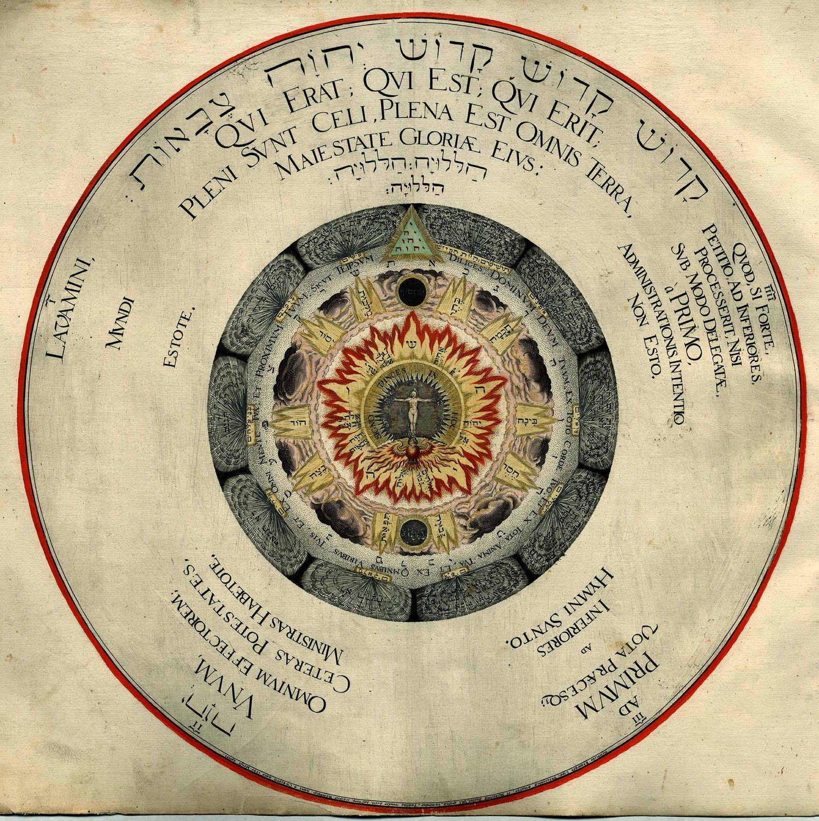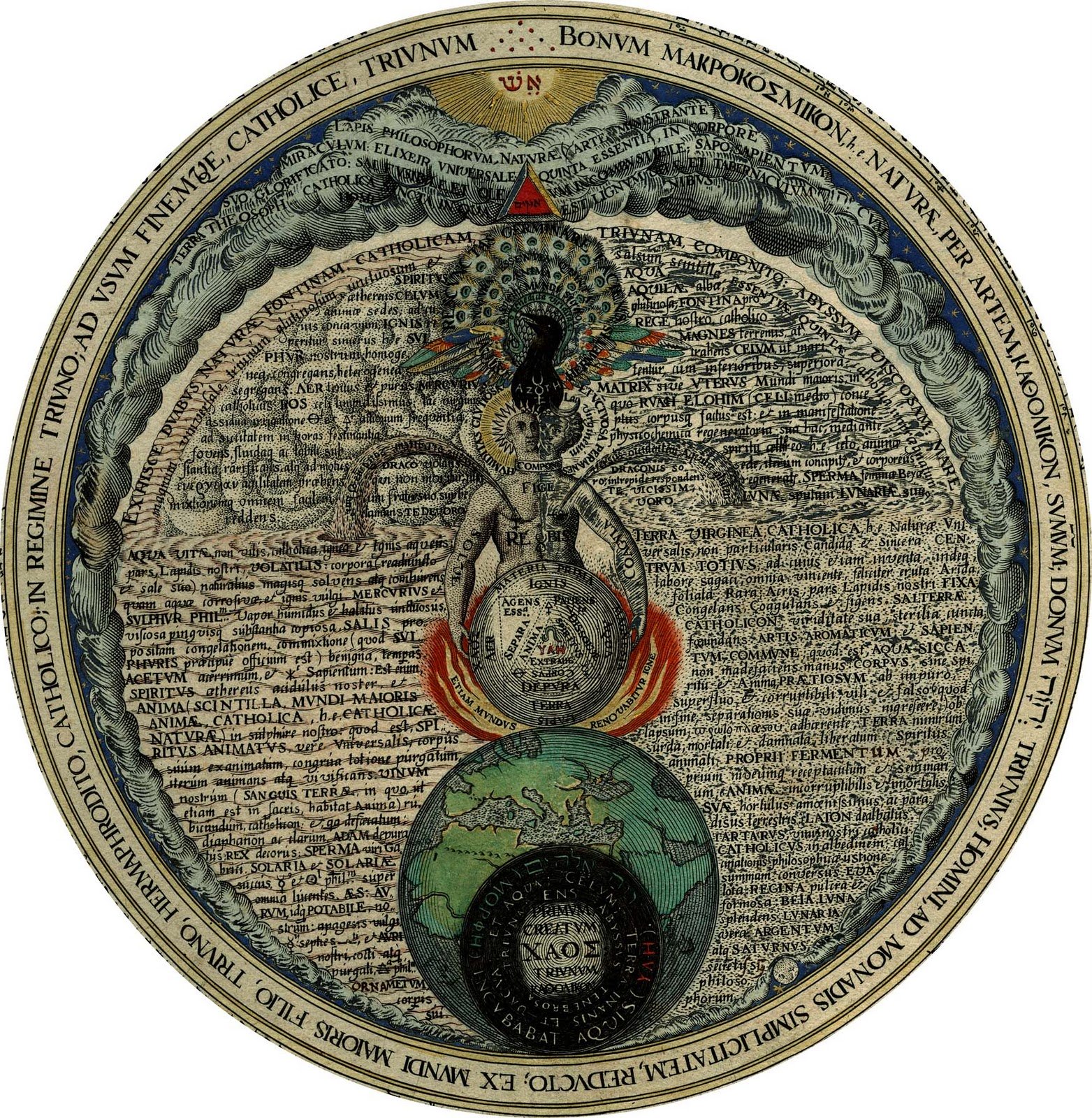 Yehovah elohim tseva'ot, totic, the heavenly spiritual army, the military, faithful to his neighbor, and to himself, to nature and art, the Amphitheater of eternal wisdom, the only true one: and not only virgins, from the rooms that are secret to him, the most chaste, to whom, in the whole machine of the world, you are not holier, not more prominent than any, for example, cabal, magic, alchemy, his miraculous mistress, in the oratory and laboratory, micro and macrocosm ice, by the wonderful artifice of wisely administering, according to the norm of Christian and philosophical truth, execrating sophistry from the diabolical, falsely substituting for truth, masked with disguises, purified, Catholicaq [ue] dexterity, reformed to the archetypal model, restored to the primordial simplicity of the triune, Catholic, worthy restored, cabalistic, magical, physicochemical, tertrine, Catholicon.