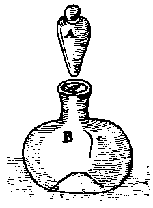A vessel may be stopped so close with quicksilver that no spirit can breathe forth, by which means the glass will be preserved from breaking by the enclosed spirits (for the head will first yield before the glass breaks). The vessel must be made as the figure hereunder shows. This also is a good way to preserve spirits already distilled from the air.