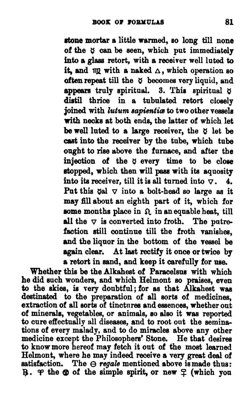 “The property therefore of our water is, that it melts or dissolves gold and silver, and increases their native tincture or color. For it changes their bodies from being corporeal, into a spirituality; and it is in this water which turns the bodies, or corporeal substance into a white vapor, which is a soul which is whiteness itself, subtile, hot and full of fire. This water also called the tinging or blood-color-making stone, being the virtue of the spiritual tincture, without which nothing can be done; and is the subject of all things that can be melted, and of liquefaction itself, which agrees perfectly and unites closely with sol and luna from which it can never be separated. For it joined [joins?] in affinity to the gold and silver, but more immediately to the gold than to the silver; which you are to take special notice of. It is also called the medium of conjoining the tinctures of sol and luna with the inferior or imperfect metals; for it turns the bodies into the true tincture, to tinge the said imperfect metals, also it is the water that whiteneth, as it is whiteness itself, which quickeneth, as it is a soul; and therefore as the philosopher saith, quickly entereth into its body.”