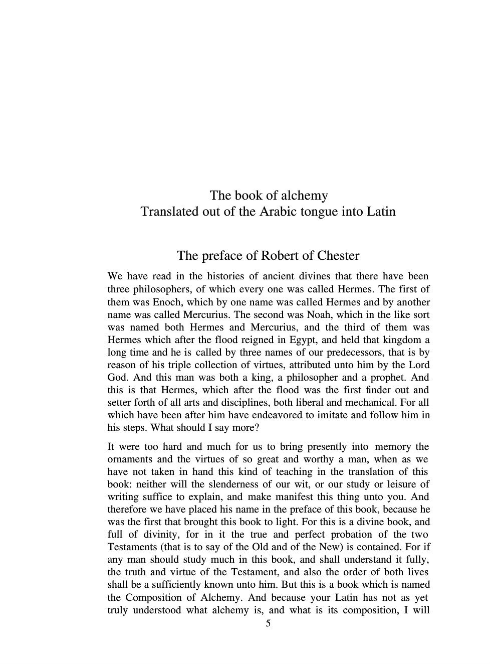 It were too hard and much for us to bring presently into memory the ornaments and the virtues of so great and worthy a man, when as we have not taken in hand this kind of teaching in the translation of this book: neither will the slenderness of our wit, or our study or leisure of writing suffice to explain, and make manifest this thing unto you. And therefore we have placed his name in the preface of this book, because he was the first that brought this book to light. For this is a divine book, and full of divinity, for in it the true and perfect probation of the two Testaments (that is to say of the Old and of the New) is contained. For if any man should study much in this book, and shall understand it fully, the truth and virtue of the Testament, and also the order of both lives shall be a sufficiently known unto him. But this is a book which is named the Composition of Alchemy. And because your Latin has not as yet truly understood what alchemy is, and what is its composition, I will therefore make it manifest and known unto you.