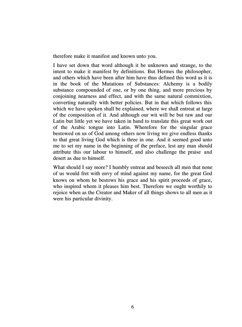 I have set down that word although it be unknown and strange, to the intent to make it manifest by definitions. But Hermes the philosopher, and others which have been after him have thus defined this word as it is in the book of the Mutations of Substances: Alchemy is a bodily substance compounded of one, or by one thing, and more precious by conjoining nearness and effect, and with the same natural commixtion, converting naturally with better policies. But in that which follows this which we have spoken shall be explained, where we shall entreat at large of the composition of it. And although our wit will be but raw and our Latin but little yet we have taken in hand to translate this great work out of the Arabic tongue into Latin. Wherefore for the singular grace bestowed on us of God among others now living we give endless thanks to that great living God which is three in one. And it seemed good unto me to set my name in the beginning of the preface, lest any man should attribute this our labour to himself, and also challenge the praise and desert as due to himself.