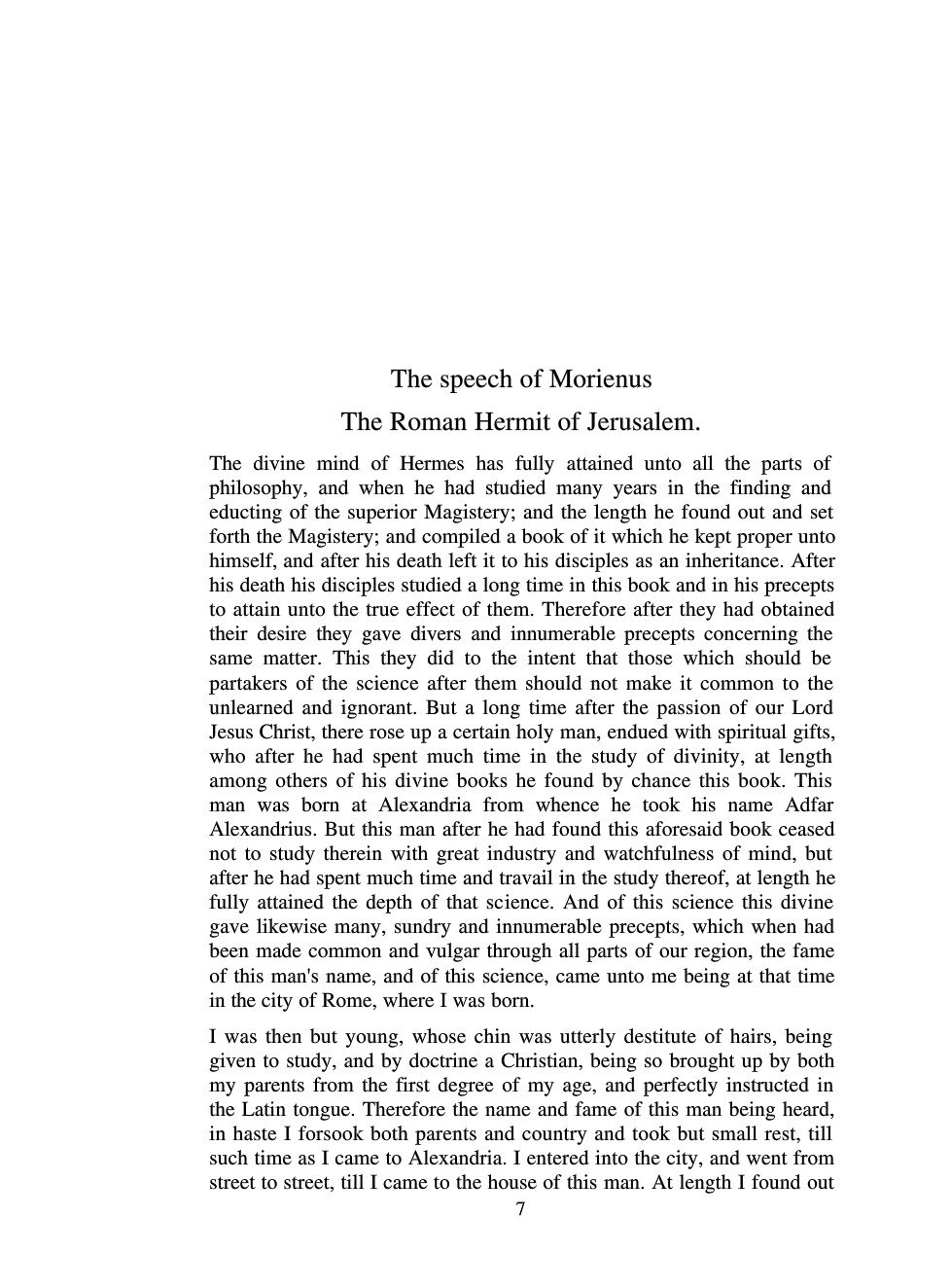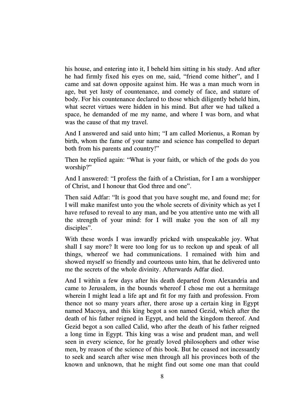 And I answered and said unto him; "I am called Morienus, a Roman by birth, whom the fame of your name and science has compelled to depart both from his parents and country!"