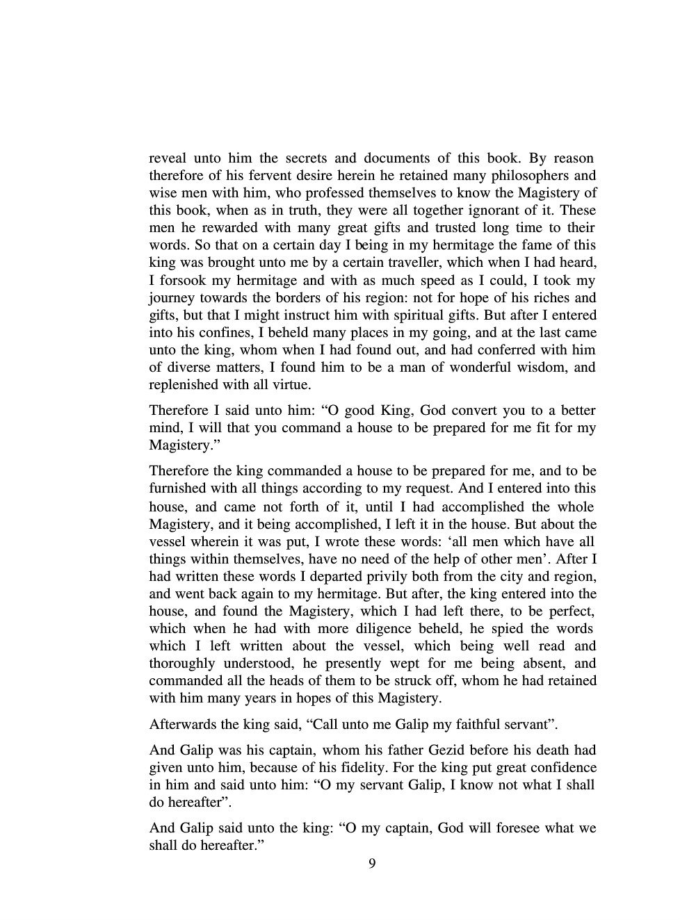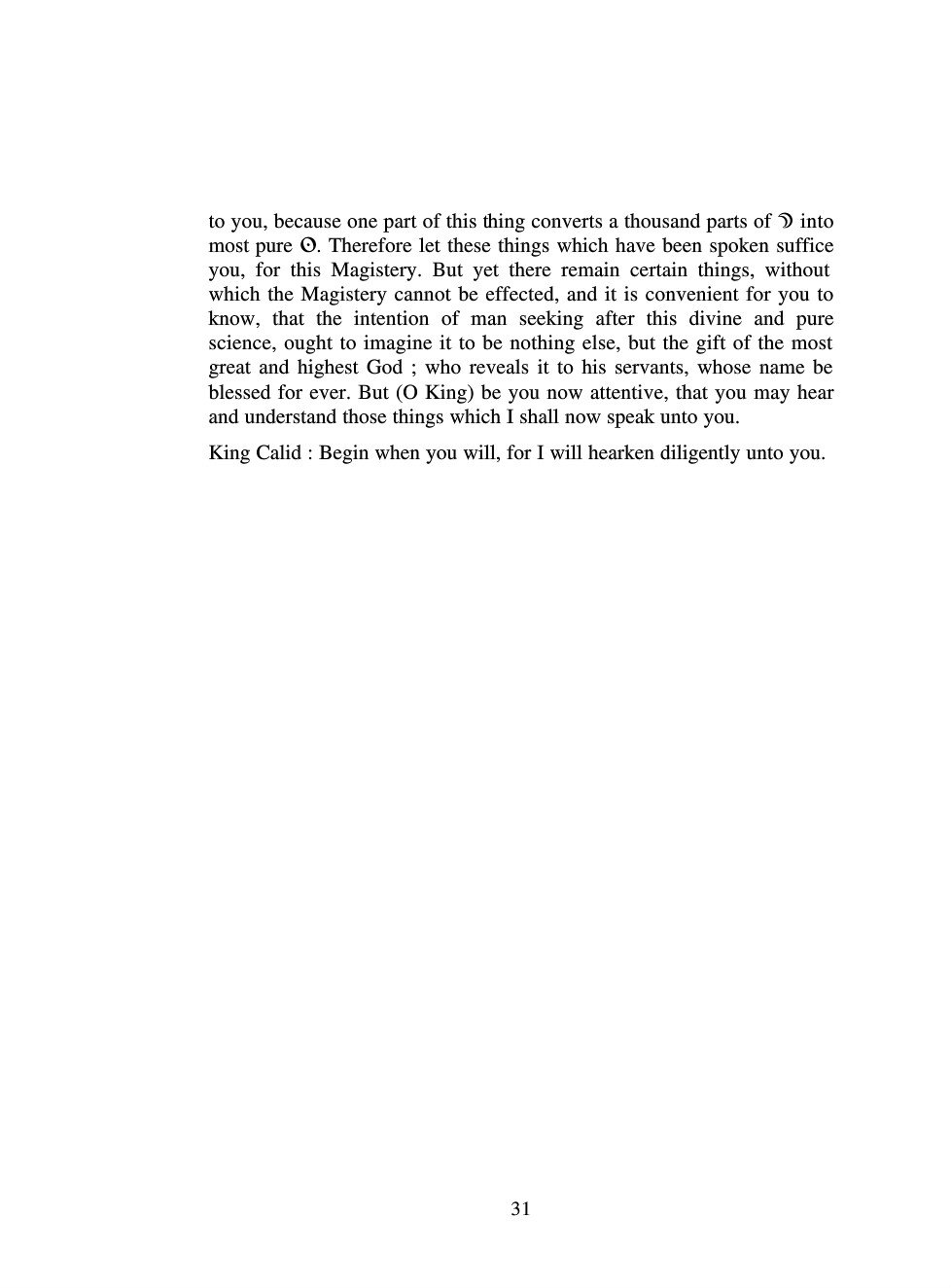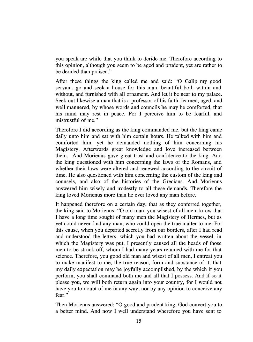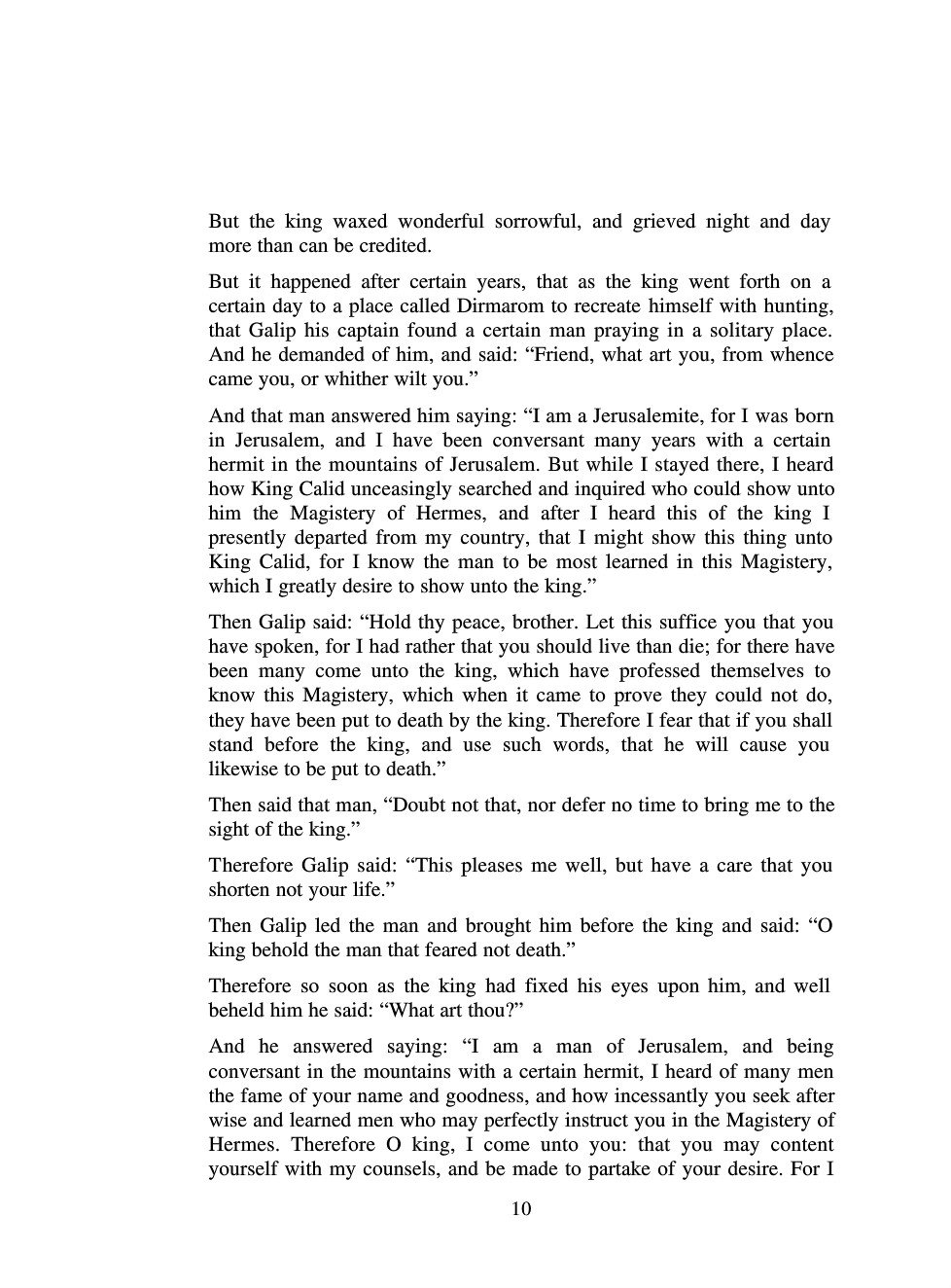 But while I stayed there, I heard how King Calid unceasingly searched and inquired who could show unto him the Magistery of Hermes, and after I heard this of the king I presently departed from my country, that I might show this thing unto King Calid, for I know the man to be most learned in this Magistery, which I greatly desire to show unto the king."