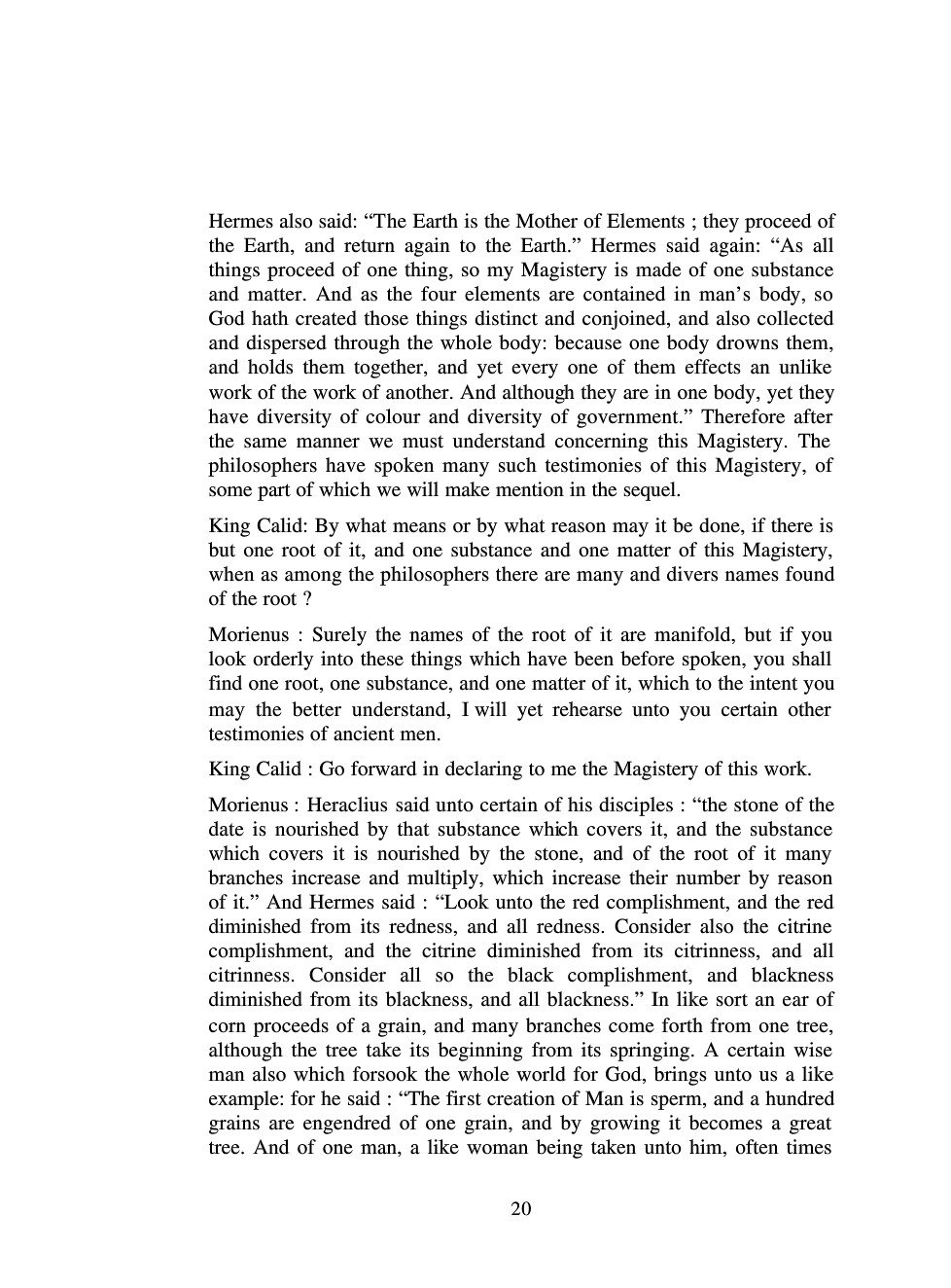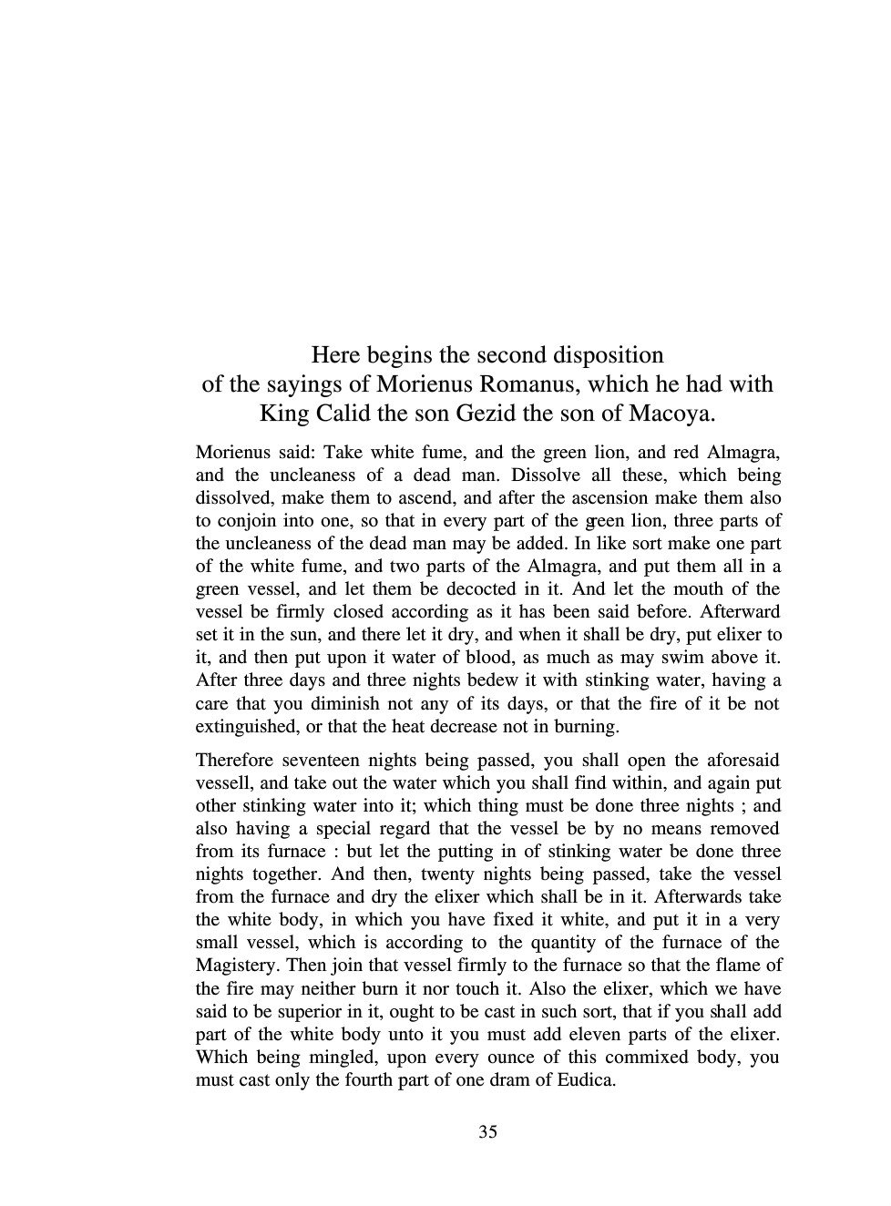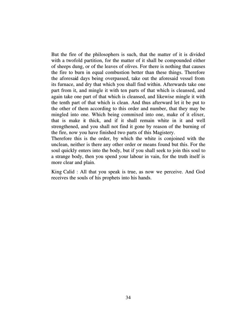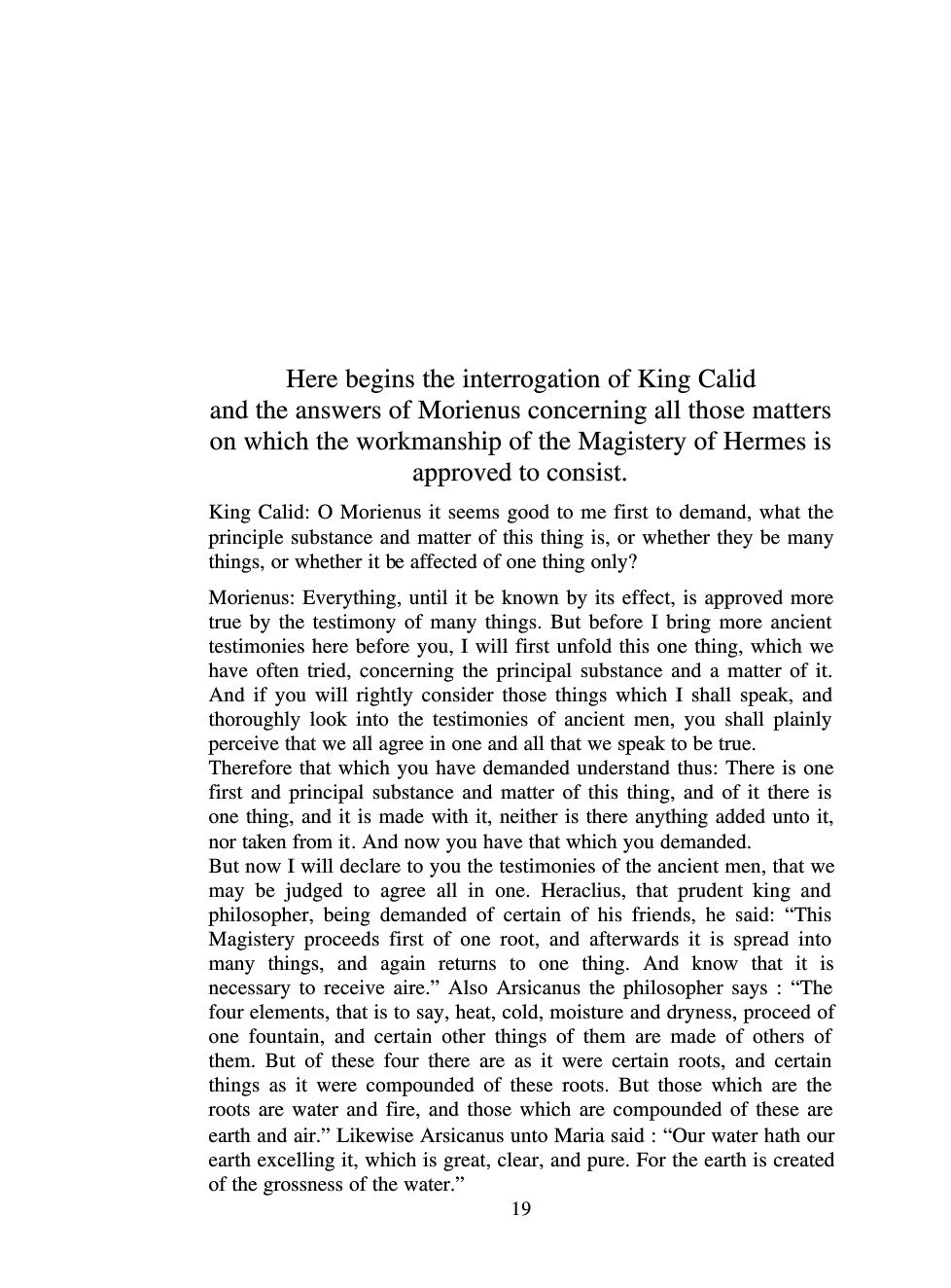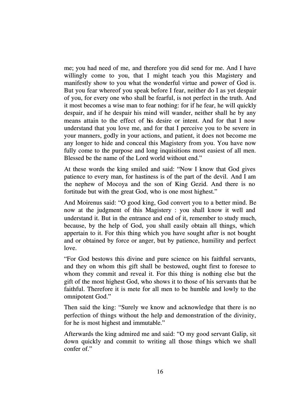 But while I stayed there, I heard how King Calid unceasingly searched and inquired who could show unto him the Magistery of Hermes, and after I heard this of the king I presently departed from my country, that I might show this thing unto King Calid, for I know the man to be most learned in this Magistery, which I greatly desire to show unto the king."