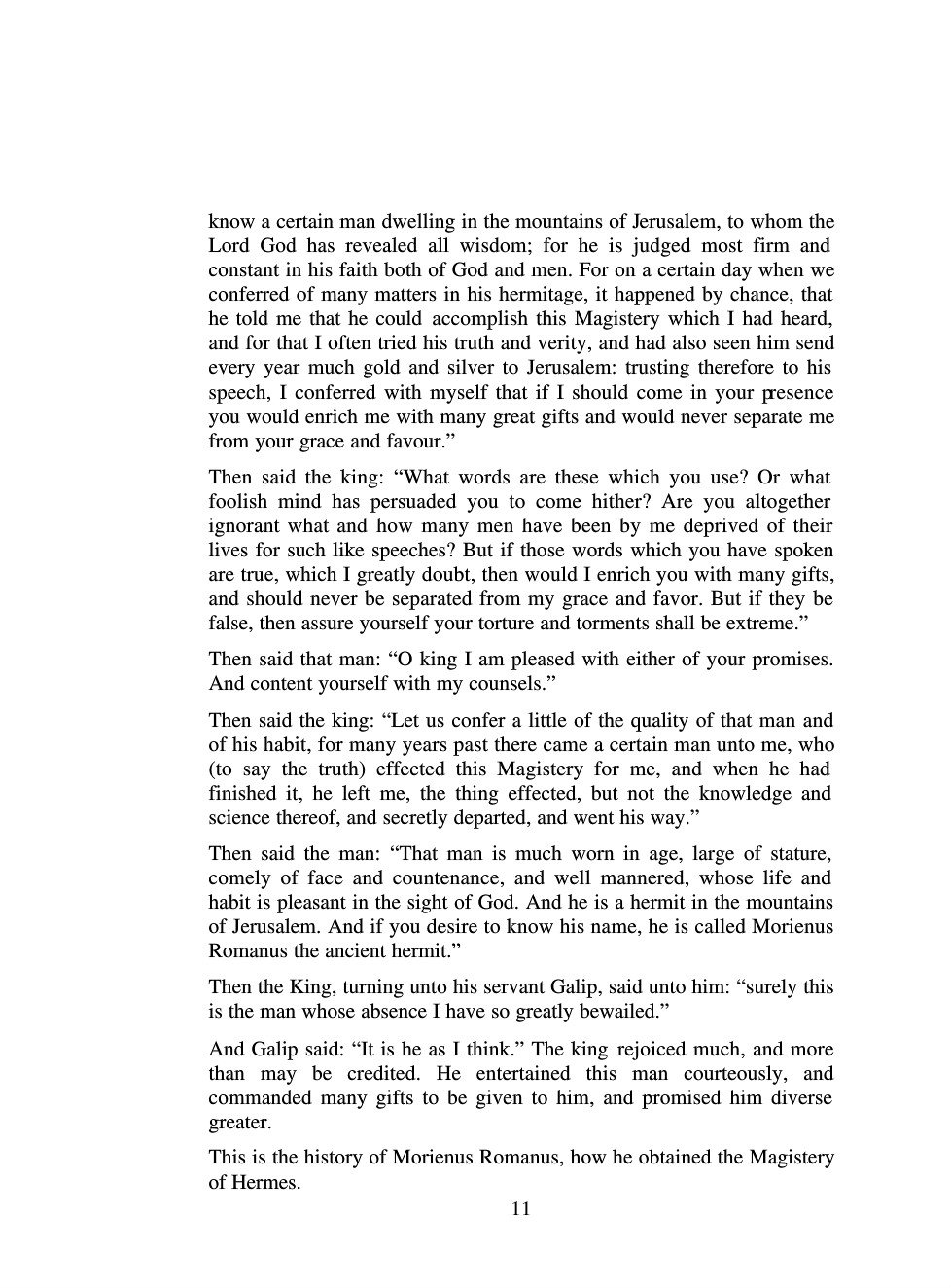 And he answered saying: "I am a man of Jerusalem, and being conversant in the mountains with a certain hermit, I heard of many men the fame of your name and goodness, and how incessantly you seek after wise and learned men who may perfectly instruct you in the Magistery of Hermes.
