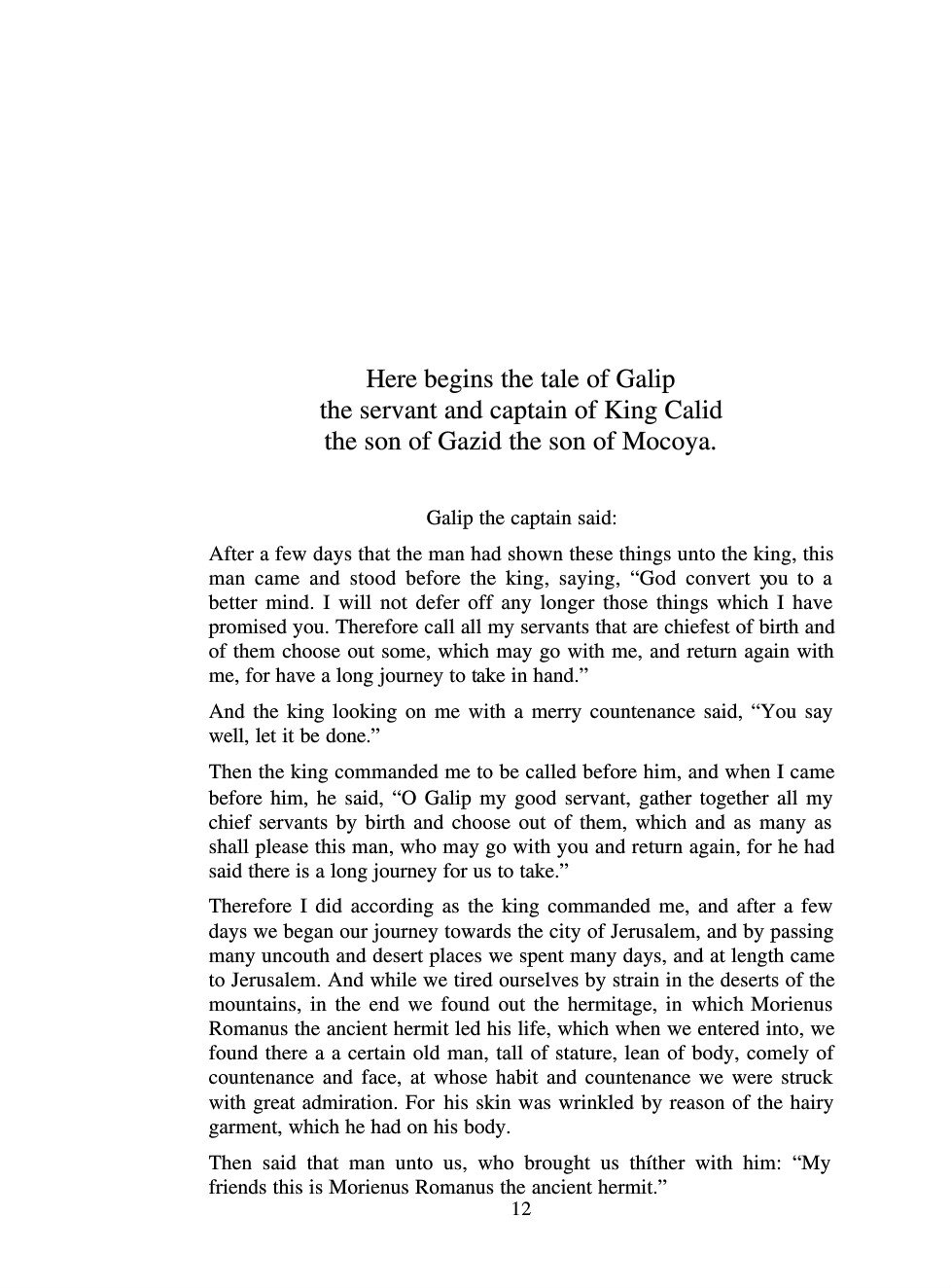 Then the king commanded me to be called before him, and when I came before him, he said, "O Galip my good servant, gather together all my chief servants by birth and choose out of them, which and as many as shall please this man, who may go with you and return again, for he had said there is a long journey for us to take."