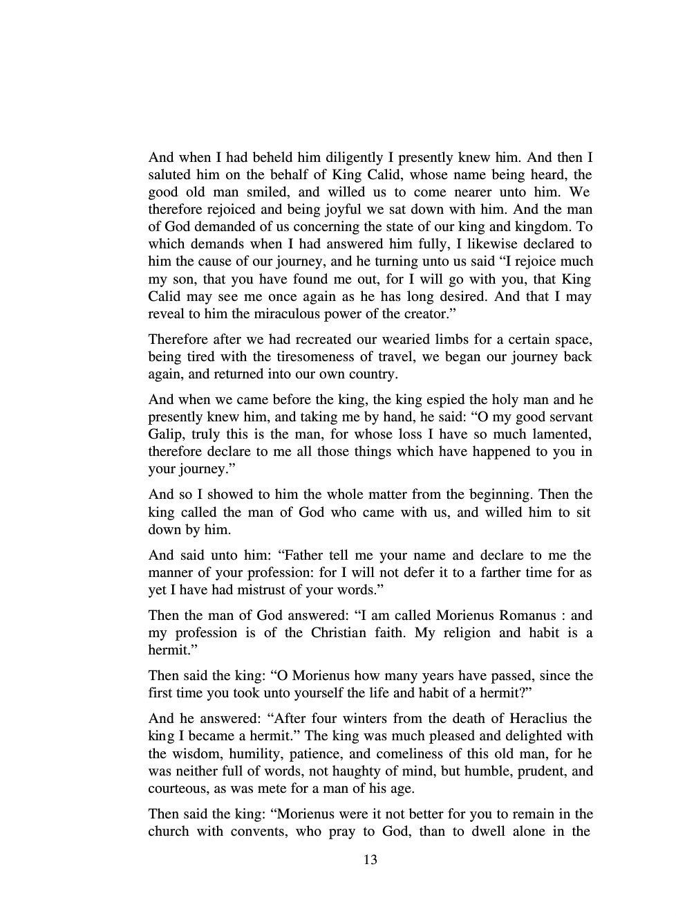 To which demands when I had answered him fully, I likewise declared to him the cause of our journey, and he turning unto us said "I rejoice much my son, that you have found me out, for I will go with you, that King Calid may see me once again as he has long desired.