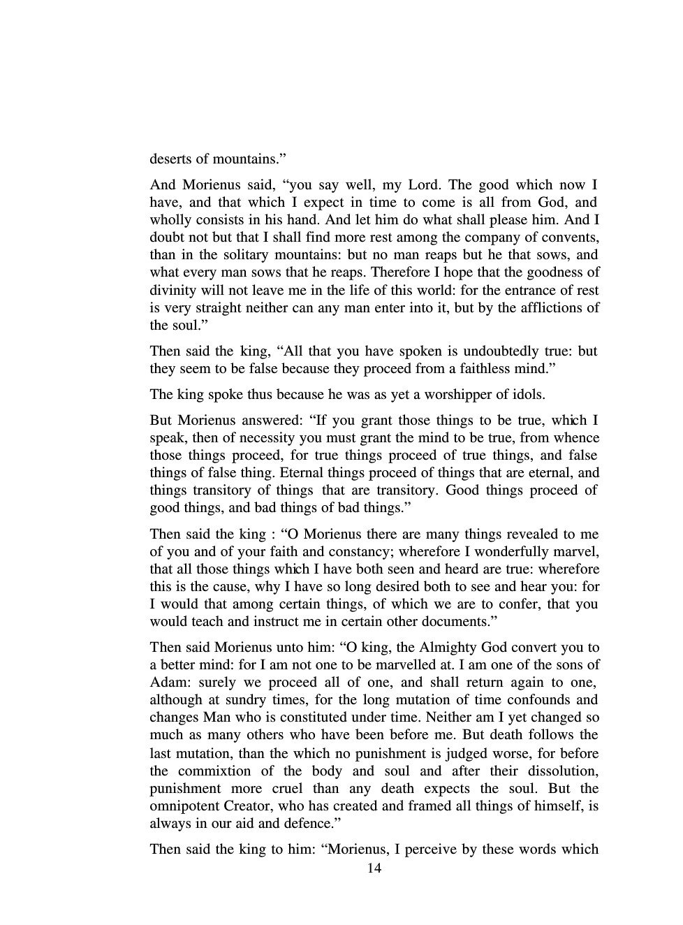 So that on a certain day I being in my hermitage the fame of this king was brought unto me by a certain traveller, which when I had heard, I forsook my hermitage and with as much speed as I could, I took my journey towards the borders of his region: not for hope of his riches and gifts, but that I might instruct him with spiritual gifts.