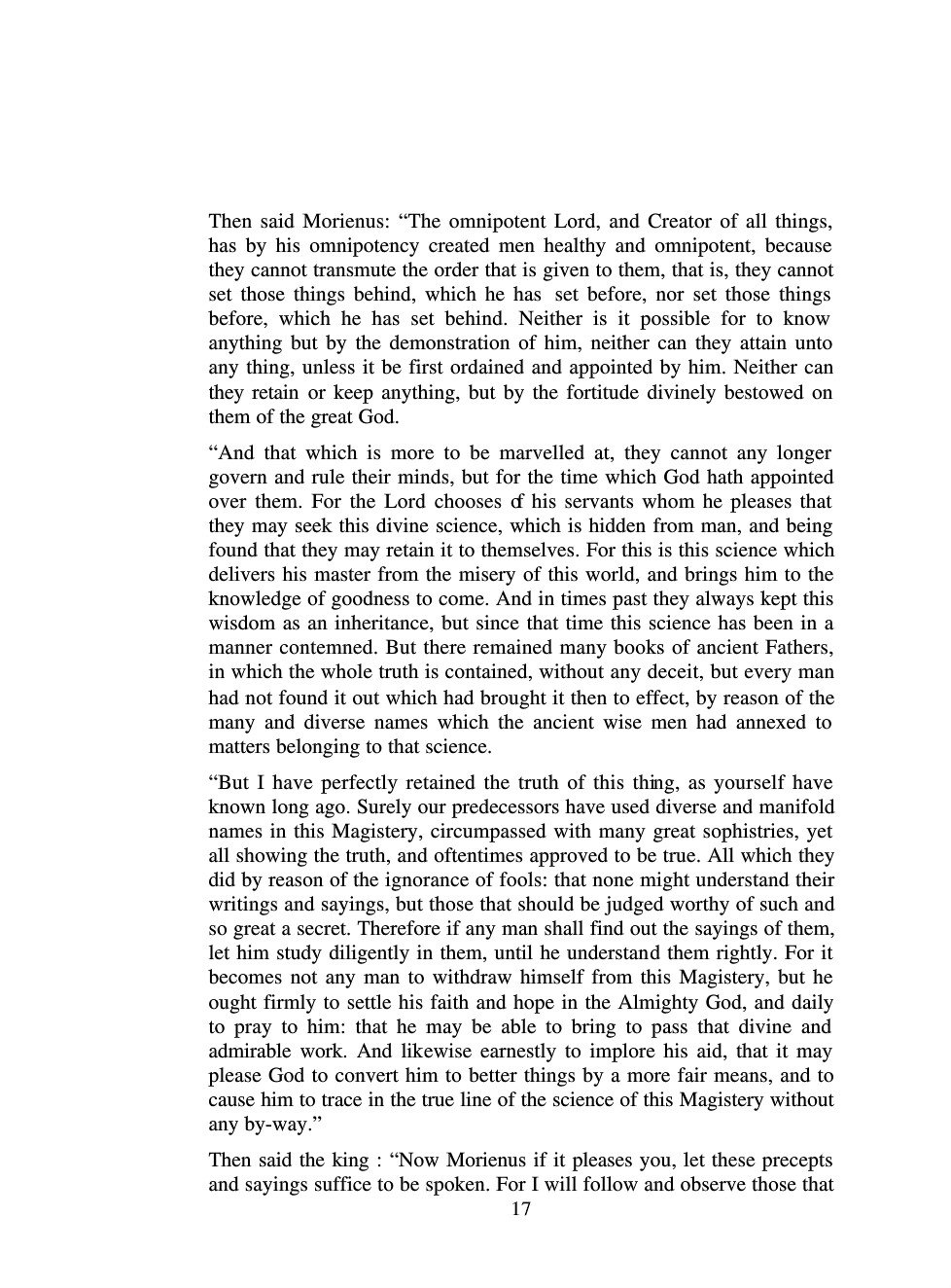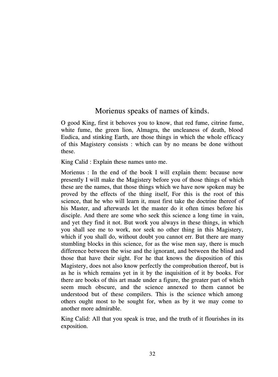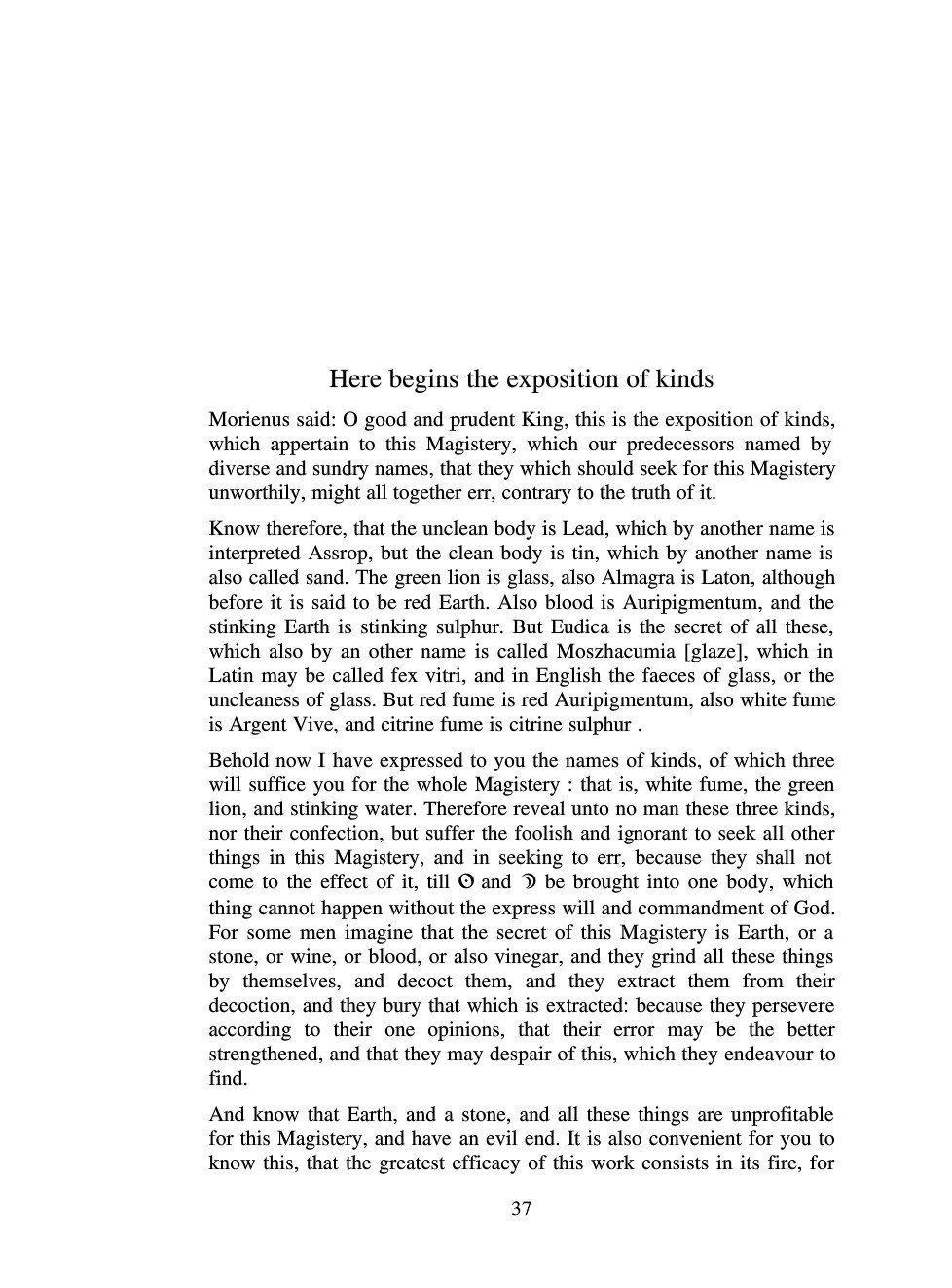 Morienus said: O good and prudent King, this is the exposition of kinds, which appertain to this Magistery, which our predecessors named by diverse and sundry names, that they which should seek for this Magistery unworthily, might all together err, contrary to the truth of it.